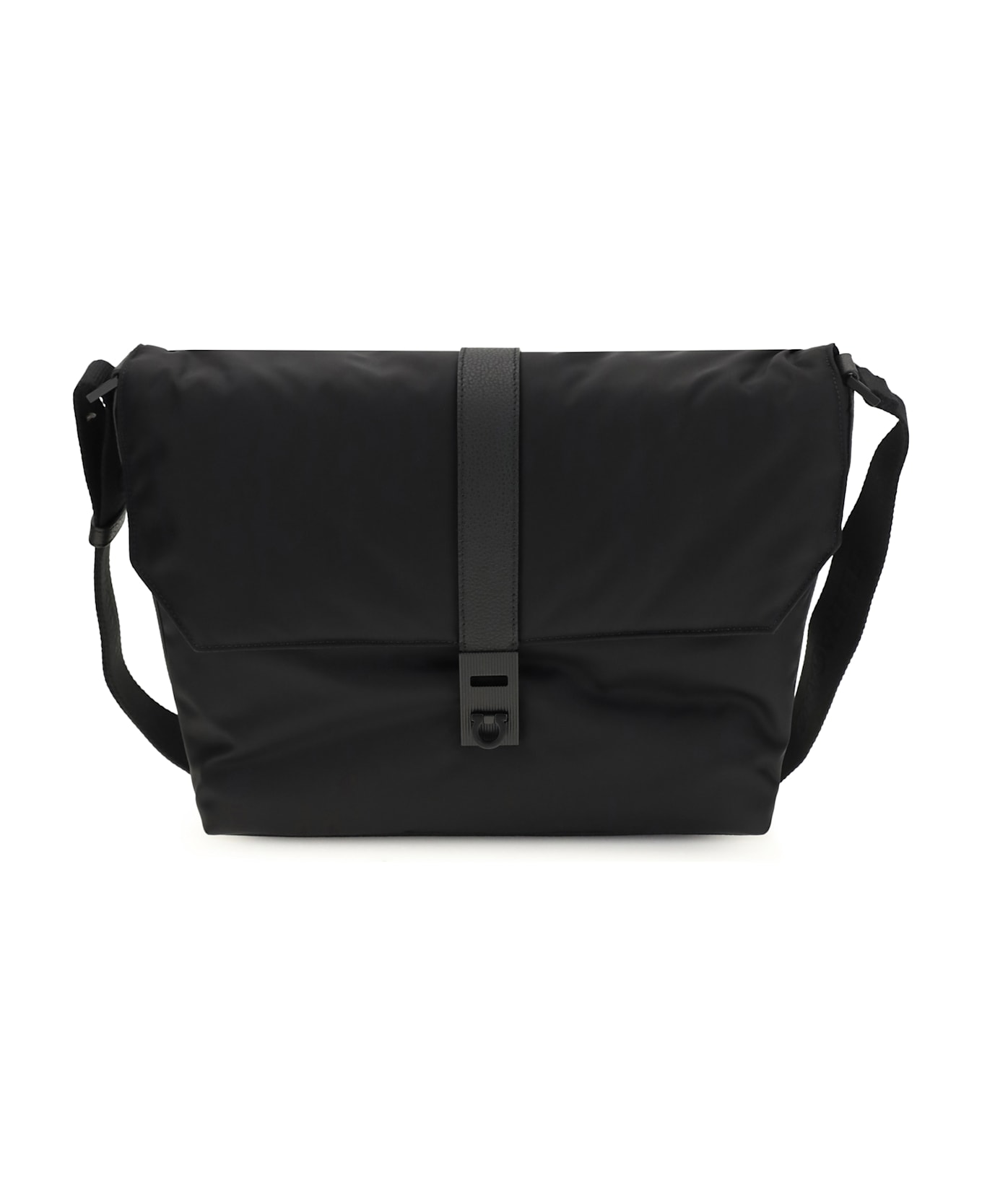 The nylon shoulder bag by ferragamo is a practical and sophisticated accessory, featuring an adjustable shoulder strap that guarantees comfort and versatility. the front flap closure and gancini-shaped turnlock, the brand's distinctive symbol, add a touch of elegance. the signature printed on the back emphasizes its authenticity and craftsmanship. perfect for everyday use, this bag is ideal for those looking for a mix of style and functionality. Composition: 100% % Nylon