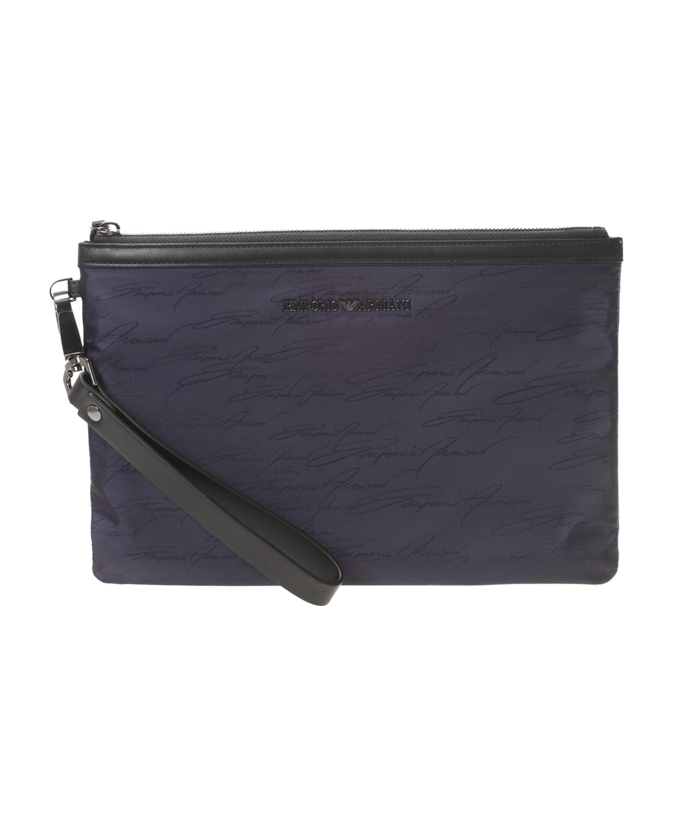 Emporio Armani pouch in nylon. Provided with a practical removable cuff. Embossed lettering logo. All-over Emporio Armani signature print. Zip closure. Dimensions: 30 x 19 x 1cm. Composition: 100% polyamide. Made in China.