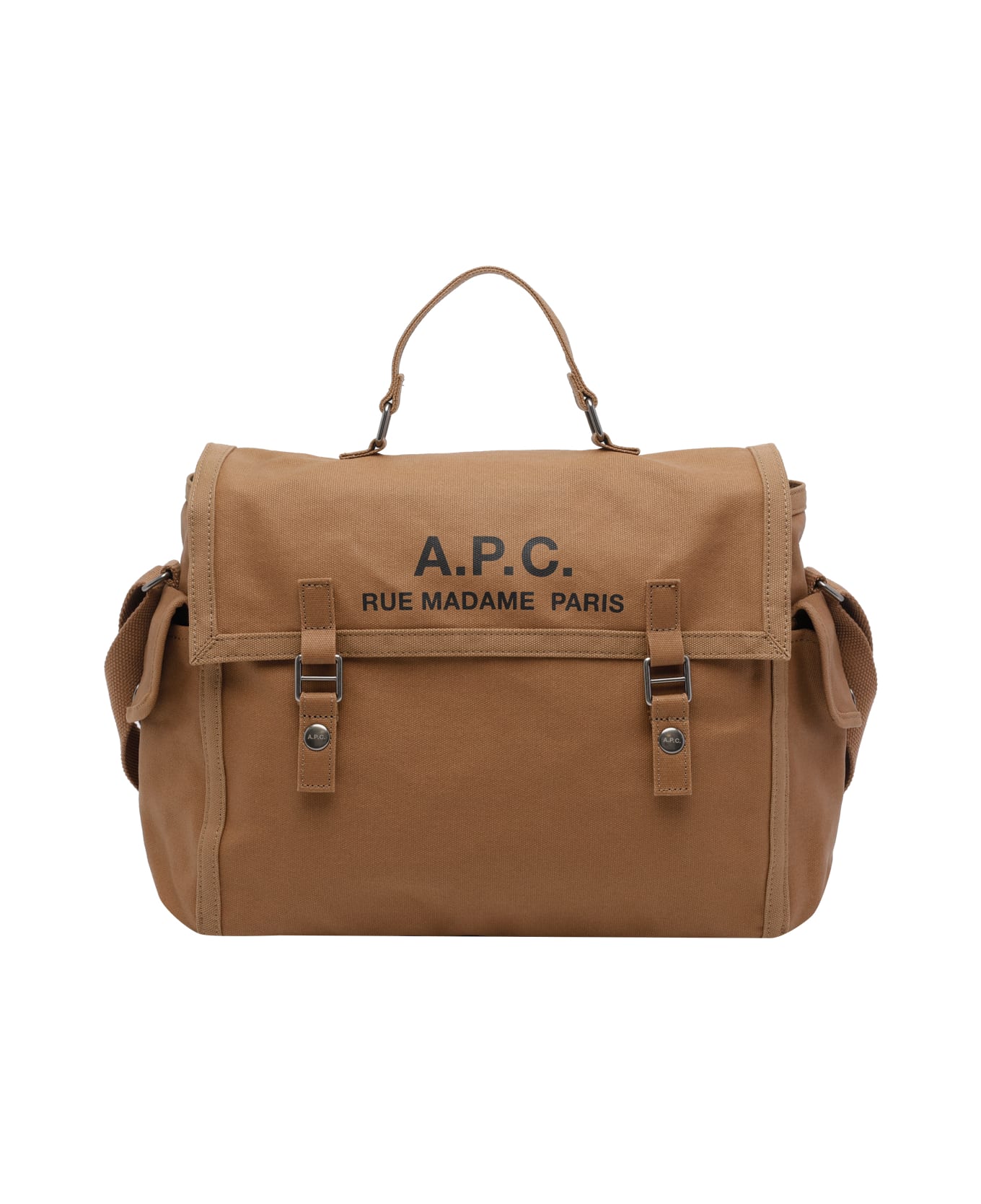 A. P. C. camel Besace Recuperation satchel bag, clip magnetic closure, lateral clip pockets, 2 inner sections, adaptable strap, frontal logo Composition: 100% Cotton
