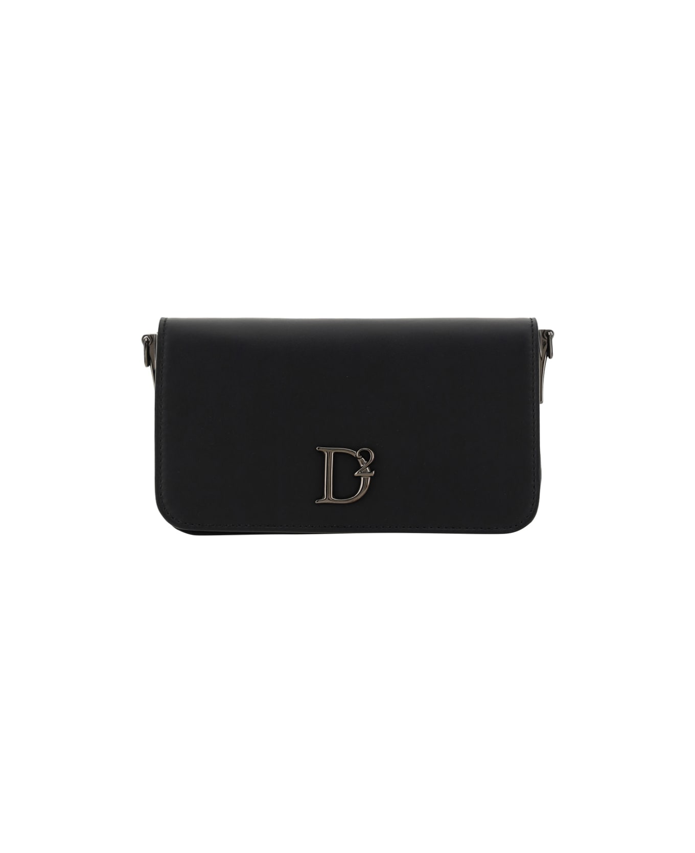 Calfskin small shoulder bag by dsqaured2, adjustable flat shoulder strap at top, front magnetic flap closure, single interior compartment, iconic three-dimensional brand monogram plaque embossed on contrasting front, interior welt pocket.