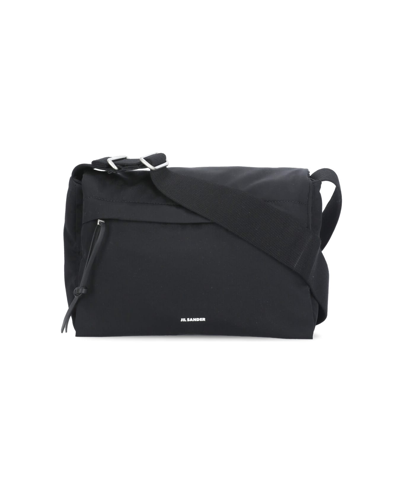 - Black Jil Sander shoulder bag for man - One adjustable shoulder strap - One main flap and magnetic button compartment - One front zip pocket - Front contrasting color logo - One internal pocket Composition: 97% Polyamide, 3% Polyurethane Contrast:, 100% Calf Leather