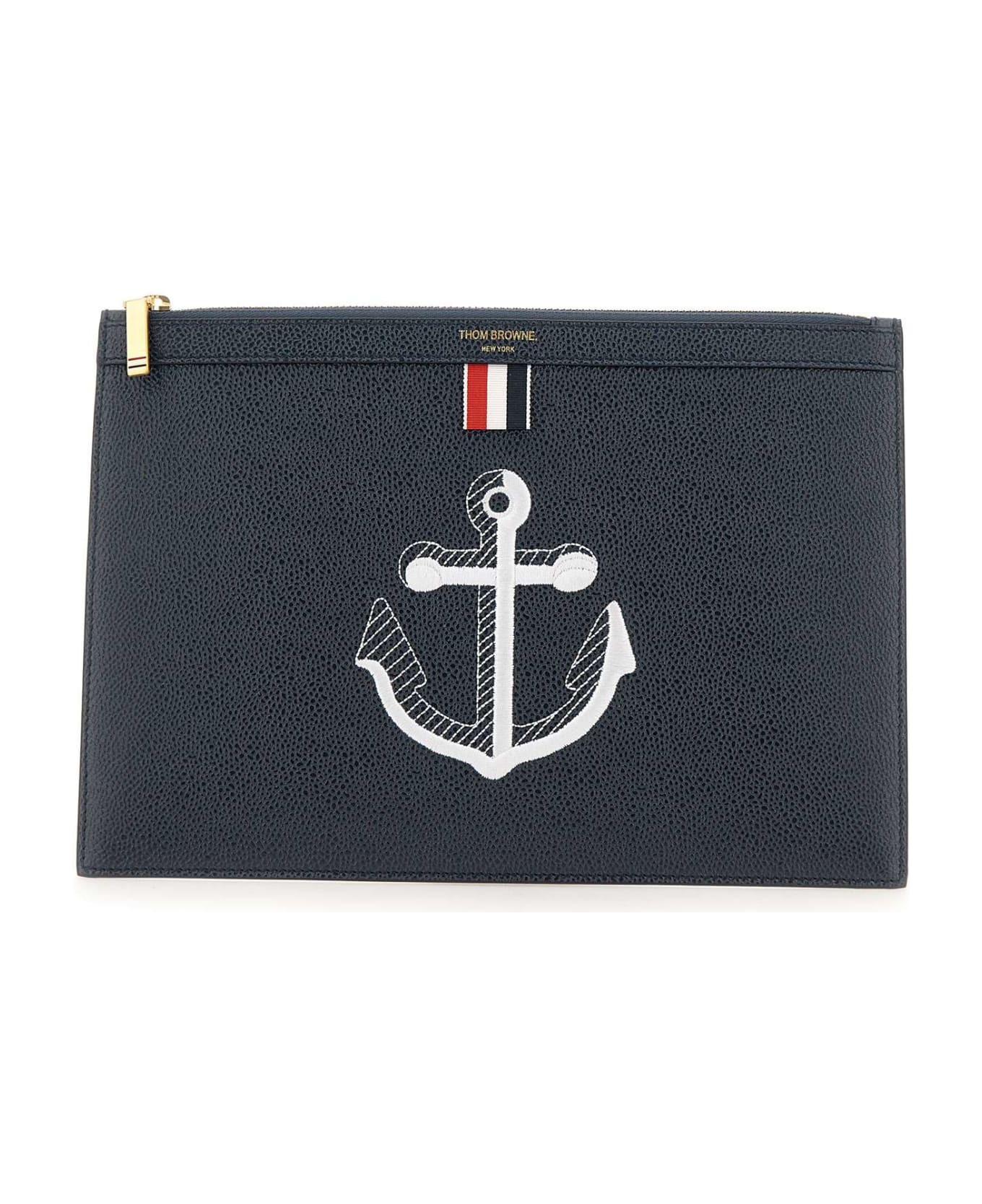 Thom Browne men's textured leather "Small Document Holder", blue, white embroidered Anchor logo on front, top fastening with brass zip, gold embossed logo on front, gros-grain tab on front. Dimensions: height 21cm, length 29cm. Made in Italy.