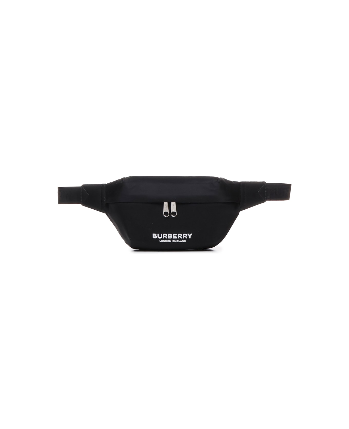 -Nylon pouch with embossed Burberry lettering -Adjustable strap with clip -Zip closure -External zippered pocket on back -Hand-painted edges -Polished metal elements -Burberry lettering embossed on front -Measurements: 31 x 7. 5 x 16 cm -Colour: Black