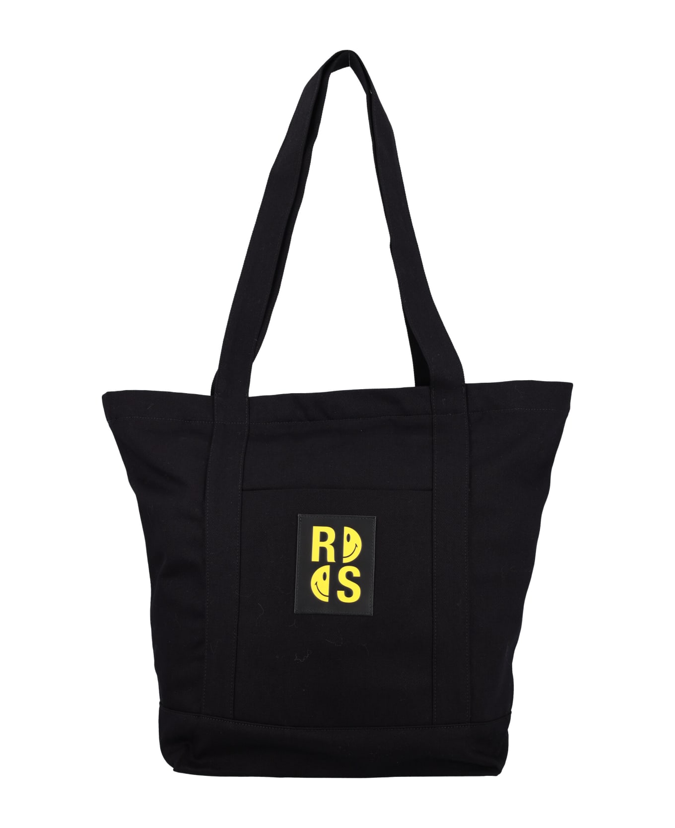 Black Cotton Denim Tote Bag By Raf Simons. Featuring: - Top Handles - Top Zip Fastening - Smiley Logo Patch At Front - Front Slit Pocket