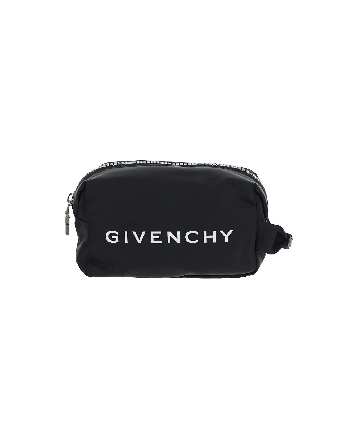 Givenchy toilet pouch in black nylon with white logo print, silver-finish G-zip closure, branded aglet, reinforced handle with leather insert and inner mesh pockets. Composition: 90% Nylon, 10% Acrylic