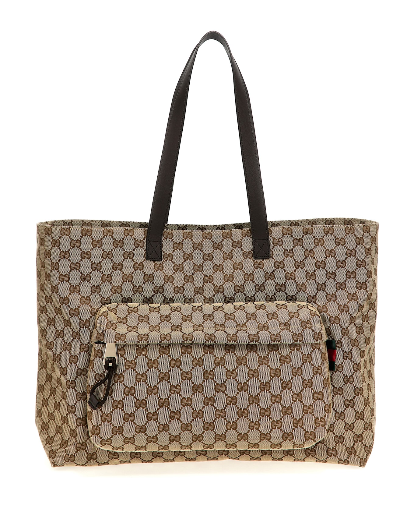 Large shopping bag in 'GG' fabric, front pocket with zip closure and embossed embossed logo, double fixed leather handle.