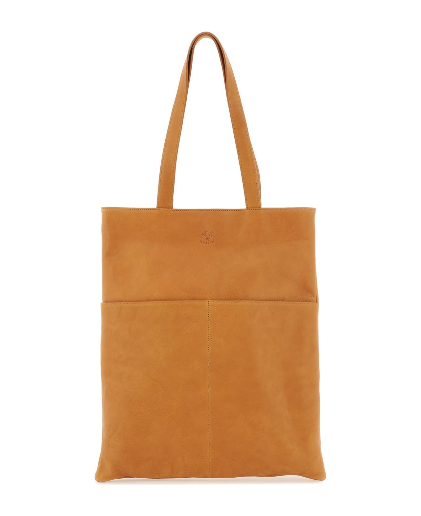 Cowhide tote bag by Il Bisonte crafted with vintage effect and embossed logo on front. Snap-button closure, lined interior with one zippered and one open pocket and two additional slit pockets on the front.