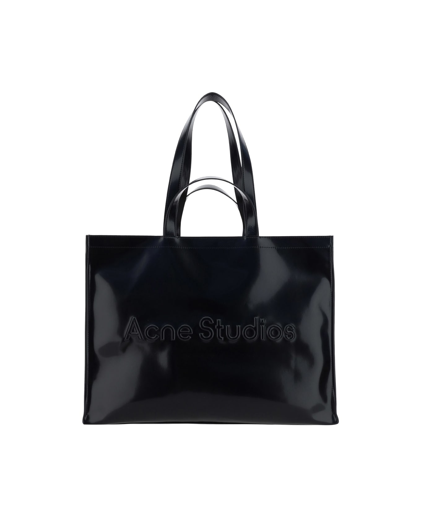Shopper bag by acne studios, double flat handles at the top, iconic brand monogram embossed on the front.