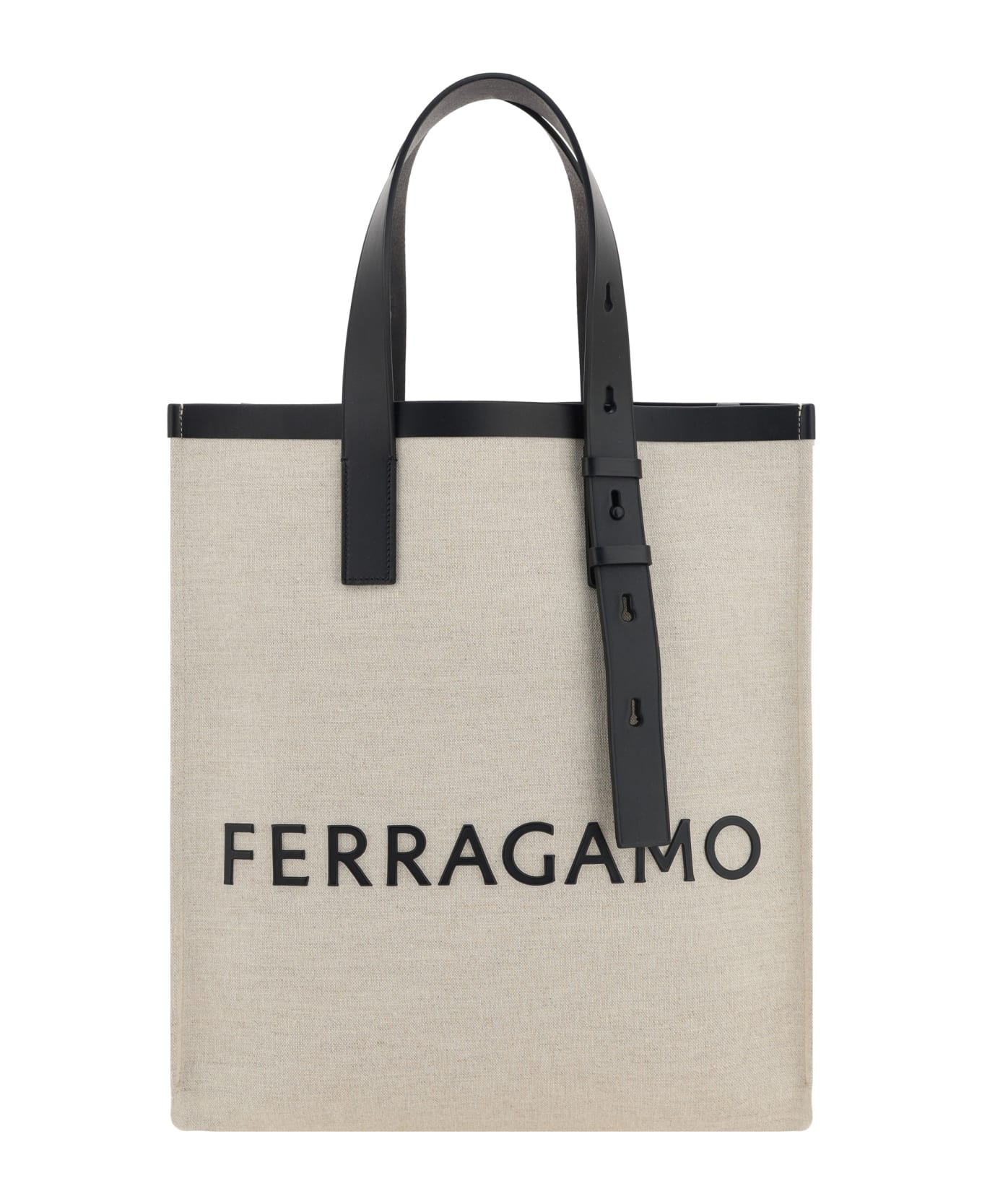 Linen tote handbag by ferragamo, contrasting leather details, double adjustable top handle, removable pouch inside, iconic brand signature in contrasting colour on the front, internal slit pocket. Composition: 100% % Cotton