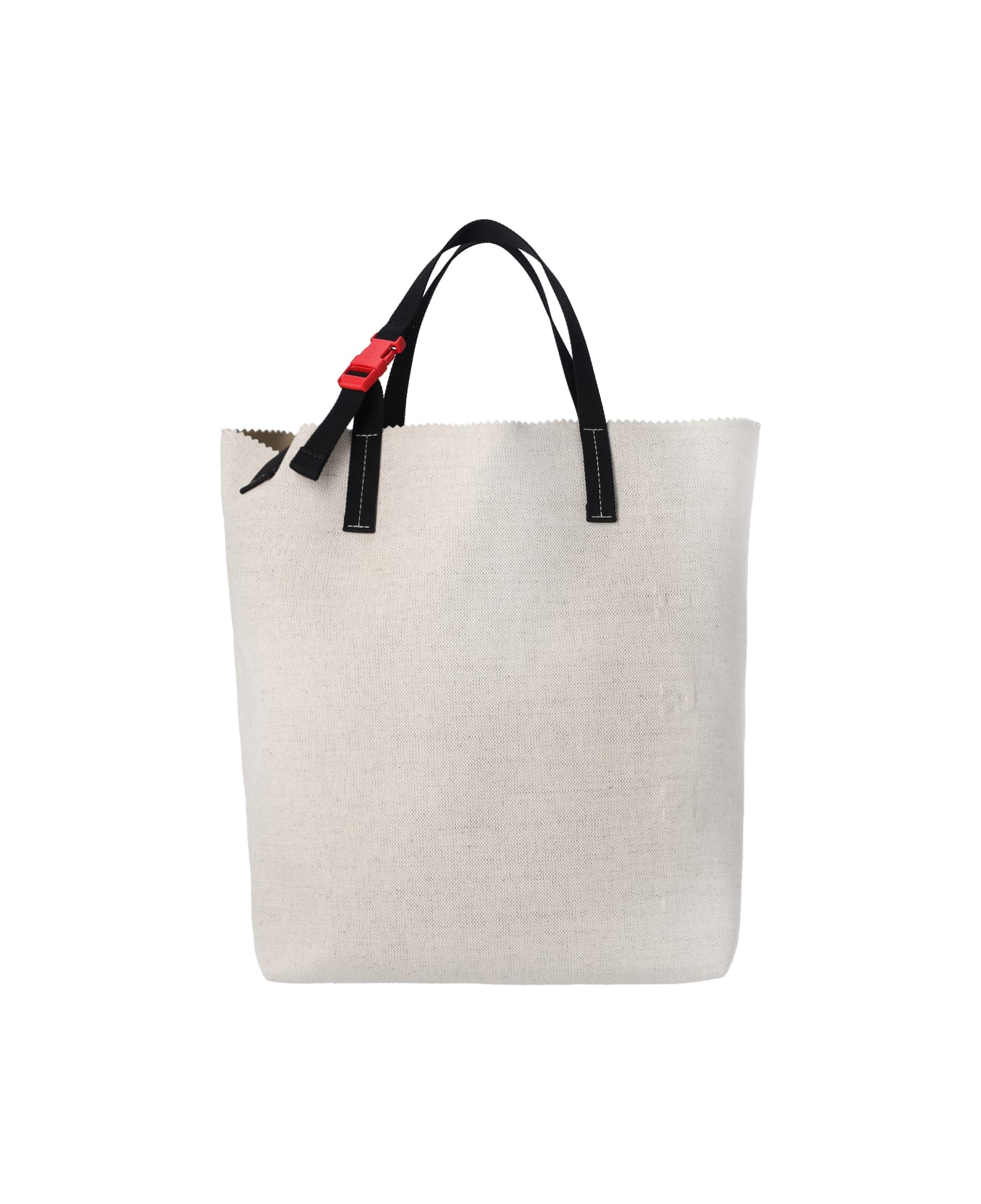 Marni Tribeca tote bag in white cotton and linen canvas, two top handles in contrast ribbon, red plastic buckle detail, adjustable ribbon shoulder strap, tone-on-tone embossed logo on the front, and main inner compartment. Composition: 70% Cotton, 30% Linen
