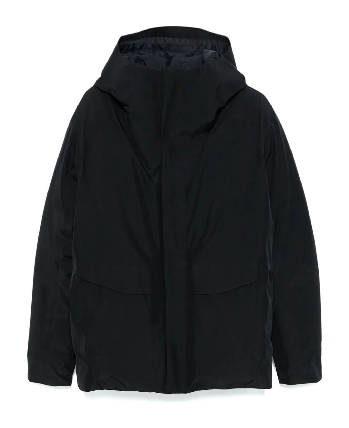 Black Sorin jacket, waterproof GORE-TEX® material, down-feather filling, front zip fastening, insulated design, padded design, classic hood, long sleeves, two side flap pockets, two side zip-fastening pockets, quilted lining, internal zip-fastening pocket, internal slip pocket, straight hem
