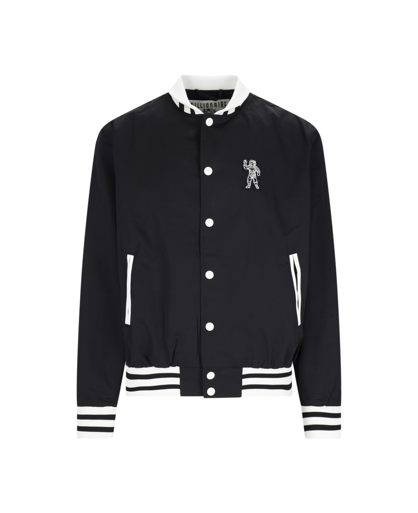Billionaire Boys Club "Arch" logo bomber jacket in black cotton blend with contrasting details, crew neck, button closure, "Astro" logo patch on the front, two side flat pockets, Arch logo print on the back, ribbed trims, striped pattern detail, straight hem.