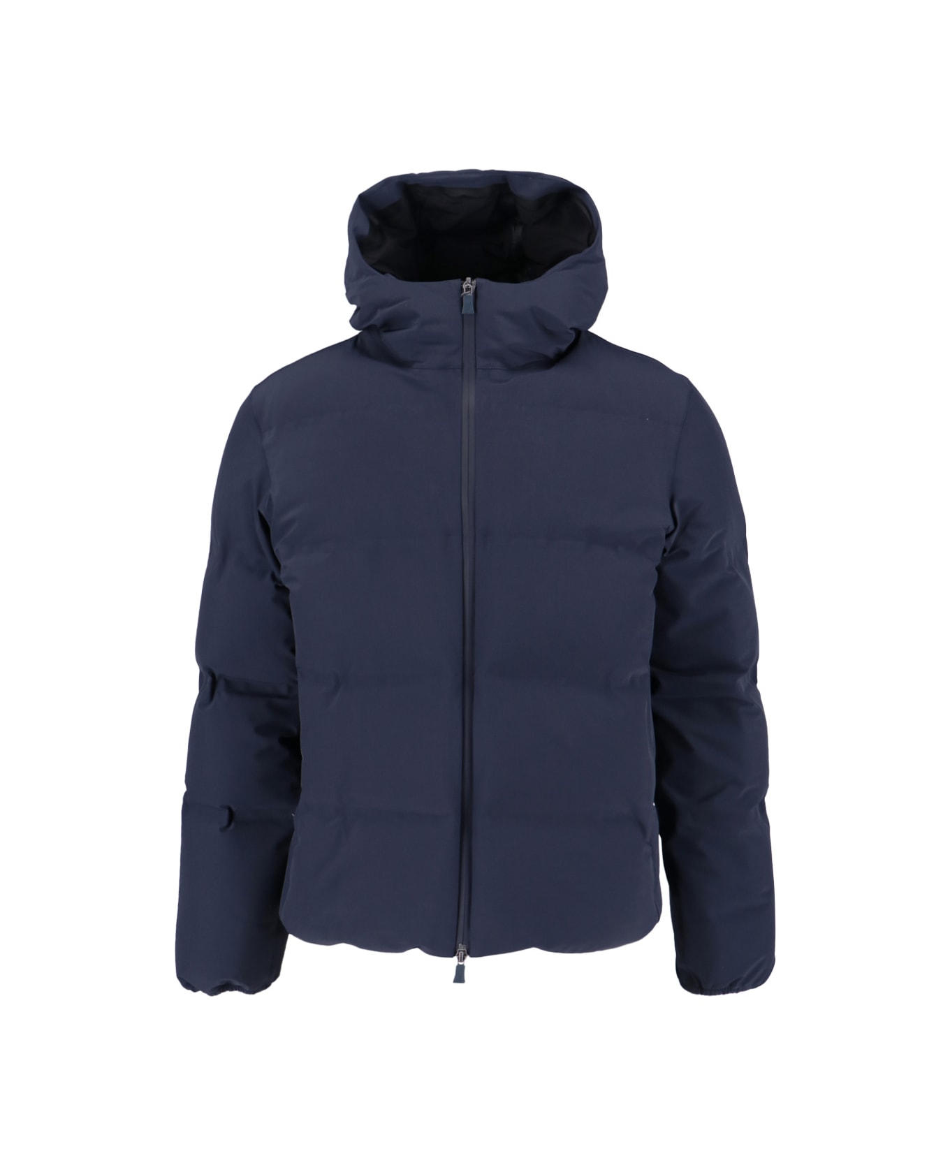 Herno 'Functional Wardrobe' down jacket in navy blue fabric with hood, double zip closure, two side zip pockets, one inner zip pocket, contrasting logo print on the back, straight hem. Composition: 89% Polyamide, 11% Elastane