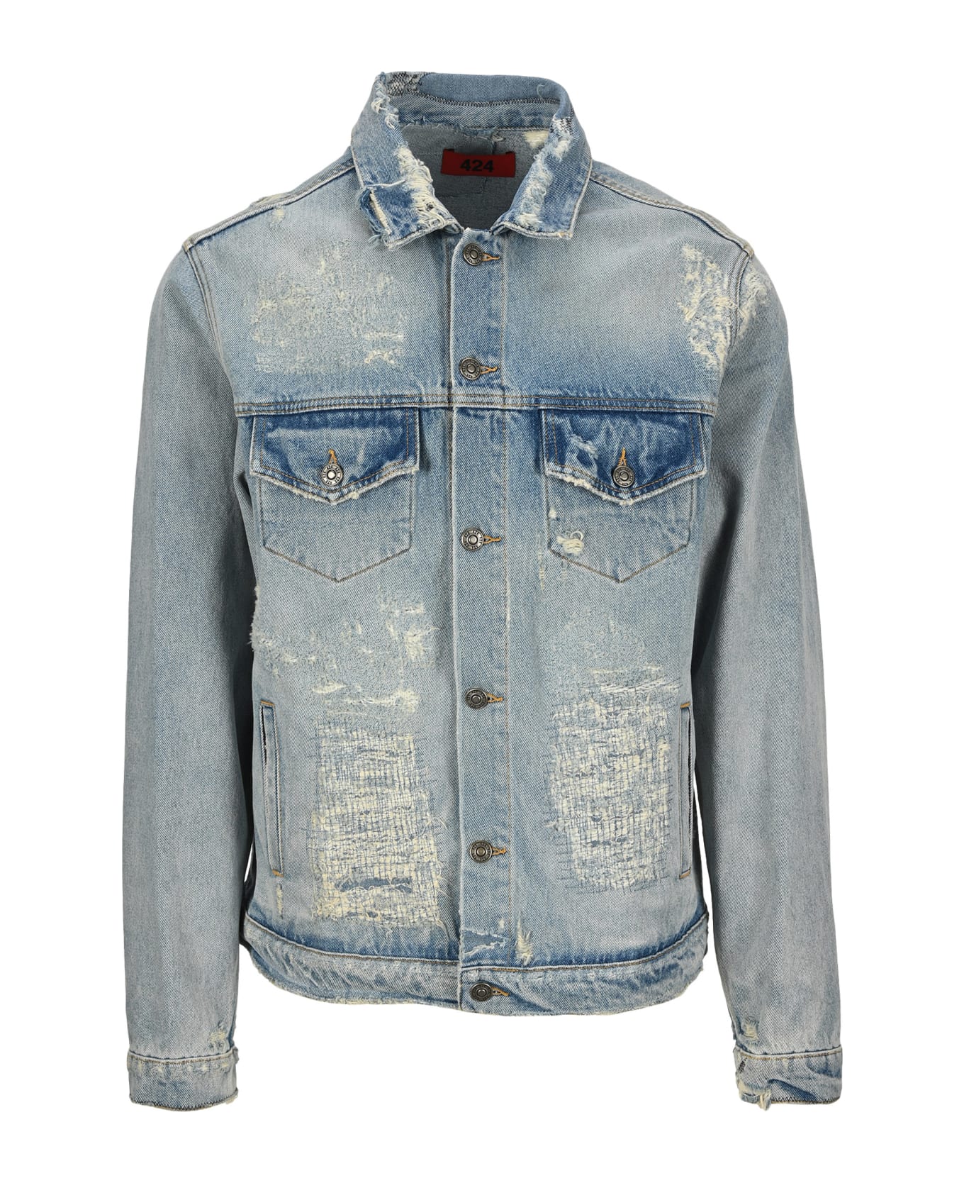 Light Blue Cotton Distressed Denim Jacket By 424. Featuring: - Classic Collar; - Front Buttons Fastening; - Flap Buttoned Pockets At The Chest; - Side Slit Pockets; - Long Sleeves; - Buttoned Cuffs; - Red Rear Logo Patch; - Straight Hem.