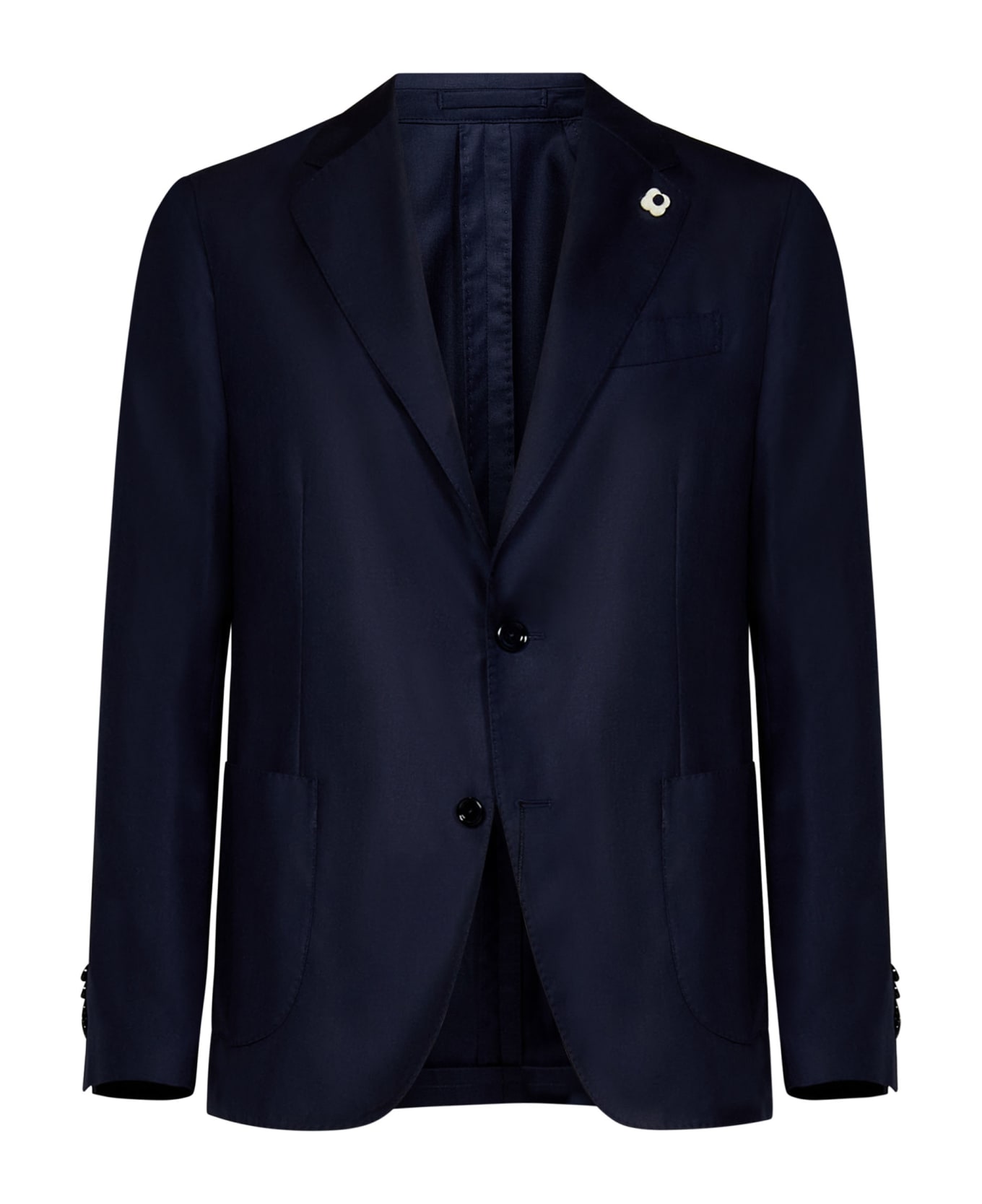 • Notched lapel, flower logo pin on the lapel; Long sleeves, natural rounded shoulders, four-button cuffs