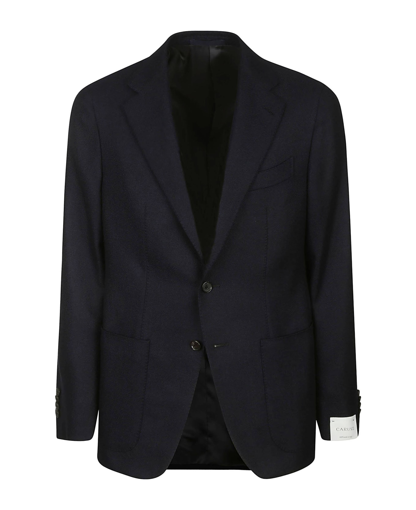 Caruso Blue cashmere jacket, classic lapels, front patch pockets, breast pocket, two button closure.