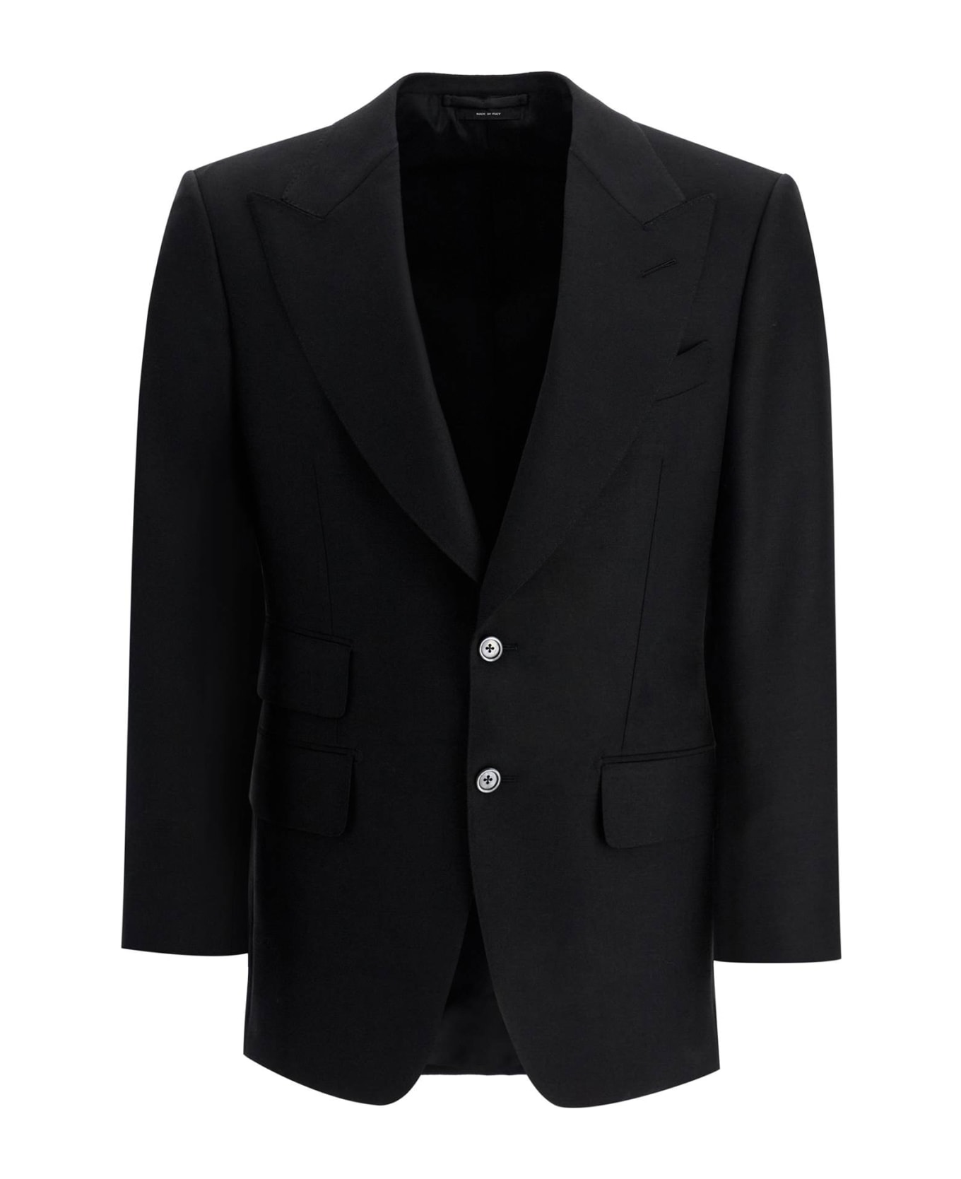 The Atticus jacket by Tom Ford is made of a blend of wool and mohair, detailed with peak lapels and a single-breasted closure with mother-of-pearl buttons. It features three front pockets with flaps, an oblique chest pocket, a back vent, and a silk-blend lining with additional pockets. The model is 187 cm tall and wears size IT 50.