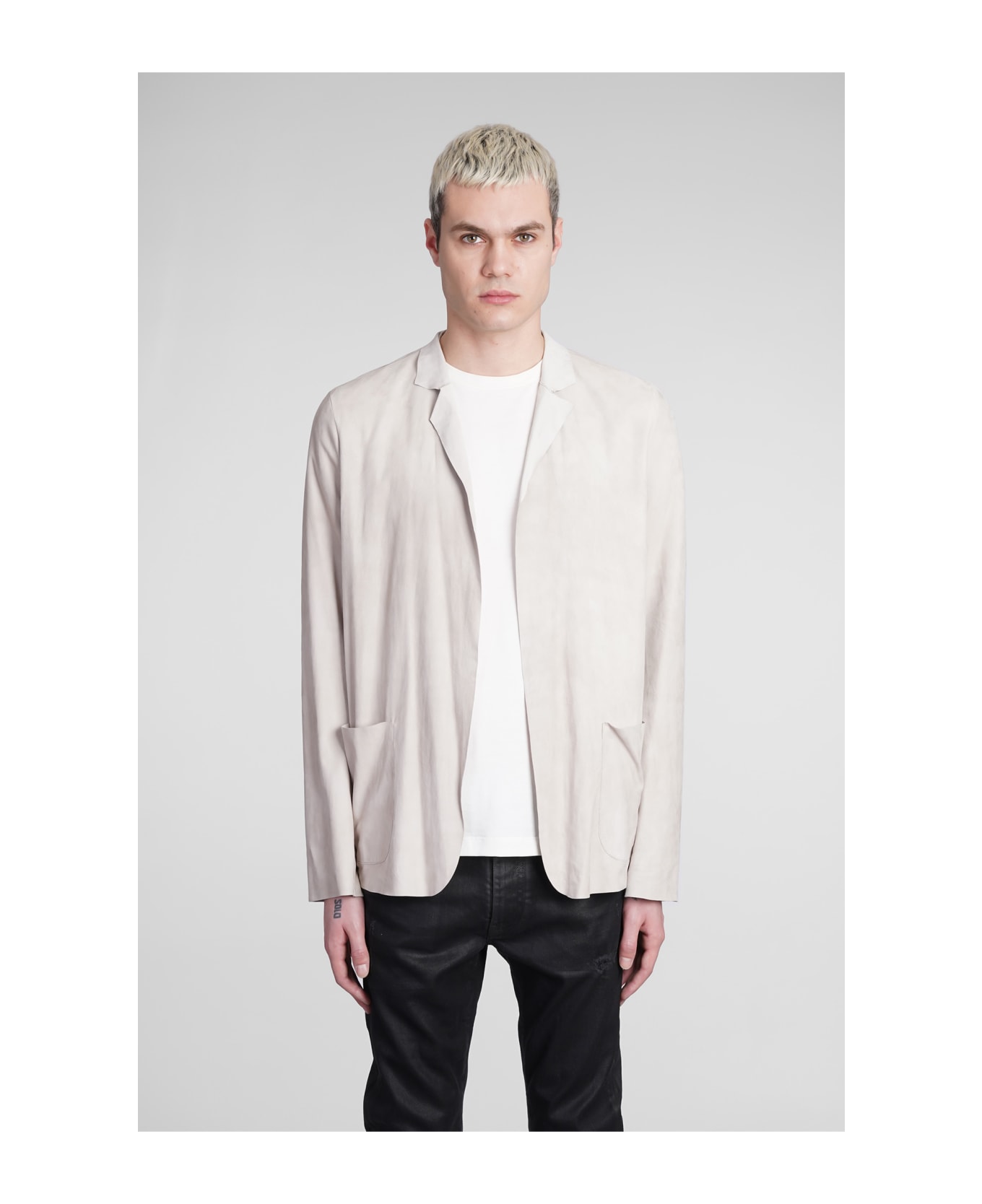 Leather jacket in beige leather, revers, no buttons, pockets, long sleeves, 100% sheep, Made in Italy, Model is 183 cm and wears 48