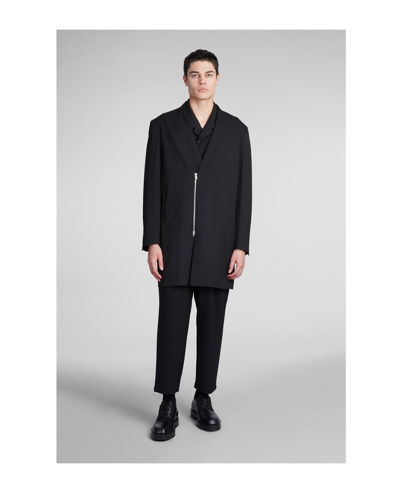Blazer in black wool, zip clousure, revers, long sleeves, 50% wool, 47%polyester, 3% Polyurethane, Made in China, Model is 1. 83 cm and wears size 1