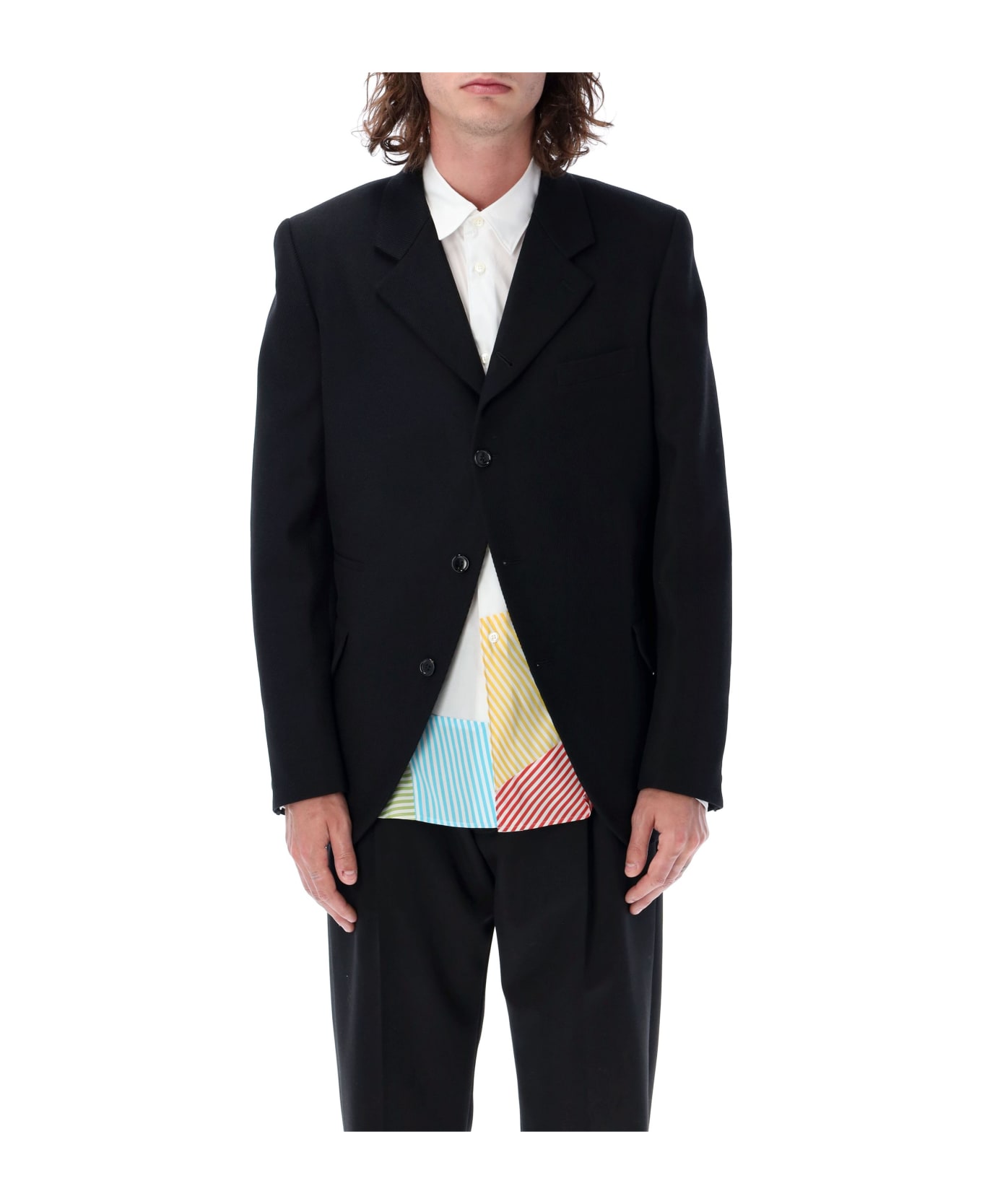 Blazer With Zip Details By Comme Des Garçons Homme Plus. Featuring: Notch Lapels Single-breast Button Fastening Chest Pocket Two Flap Pockets Padded Shoulders Long Sleeves Buttoned Cuffs Lined Three-zip Detail At Back Model Is 1,90 M Tall And He Is Wearing Size L
