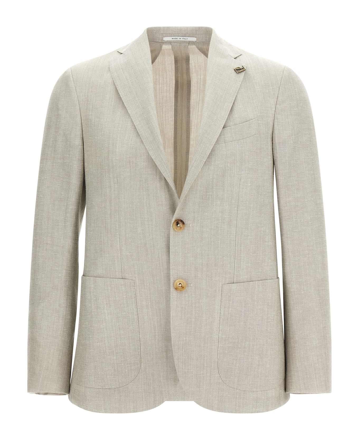 Brera' single-breasted blazer in wool, cotton and linen blend with front horn button closure, mirror lapels with removable metal pin, breast pocket, patch pockets, unlined, three internal pockets, cuffs with opening buttonholes, back vents.