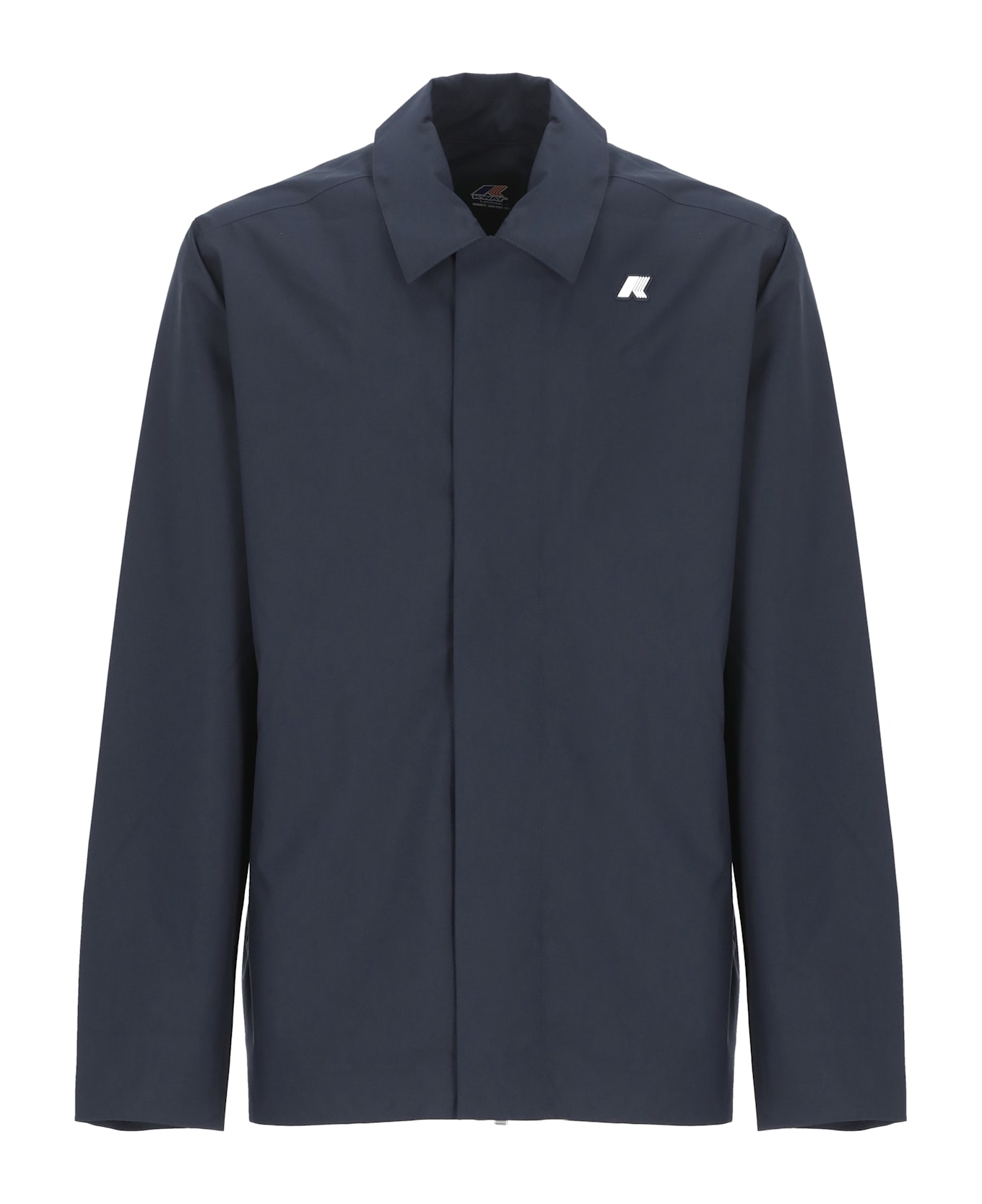 - Blue K-Way waterproof jacket for man - Collar - Long sleeves - Front contrasting colour logo - Front zip fastening and contrasting colour gros grain details - Two side pockets with snap button - Elastic trims