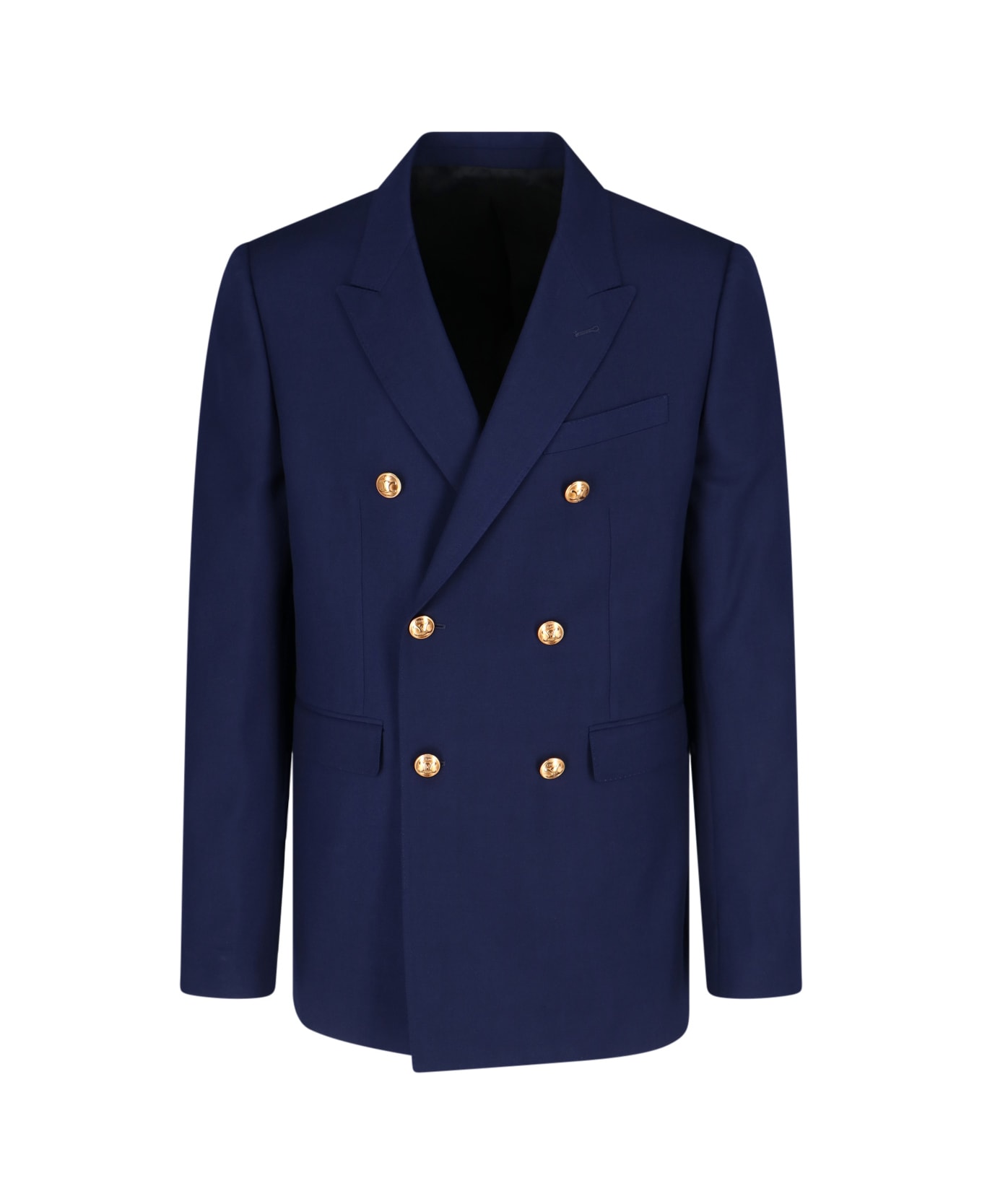 Celine 'Camden' double-breasted blazer in navy blue wool with peak lapels, logo button closure, chest pocket, two side flap pockets, buttons on the cuffs, central back vent, straight hem. Composition: 100% Wool
