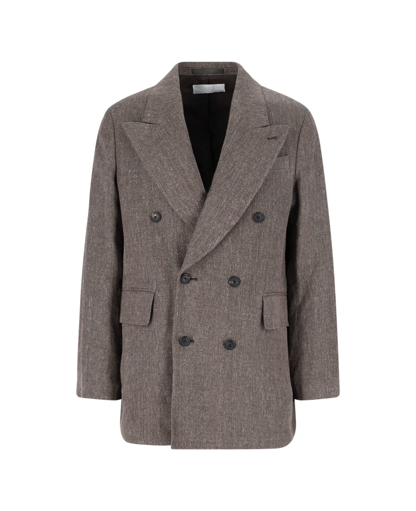Double-breasted Our Legacy blazer in brown linen and cotton with maxi peak lapels, button closure, chest pocket, two leteral flap pockets, central back vent, straight hem.
