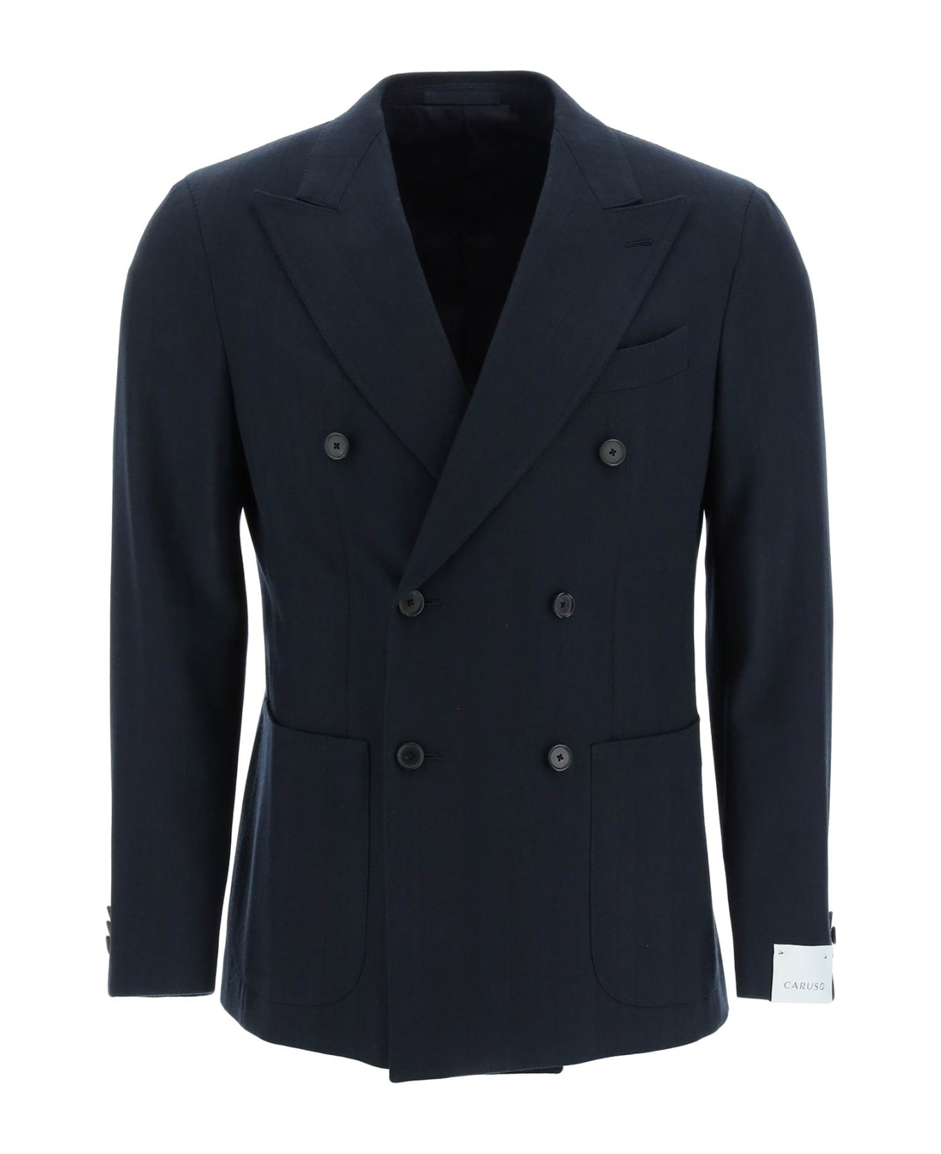 Double-breasted blazer by Caruso crafted in herringbone wool fabric, featuring a slim cut with double back vent. Six-button design with peak lapels, patch pockets and chest pocket. Fully lined in cupro, with three internal pockets. The model is 187 cm tall and wears a size IT 48.
