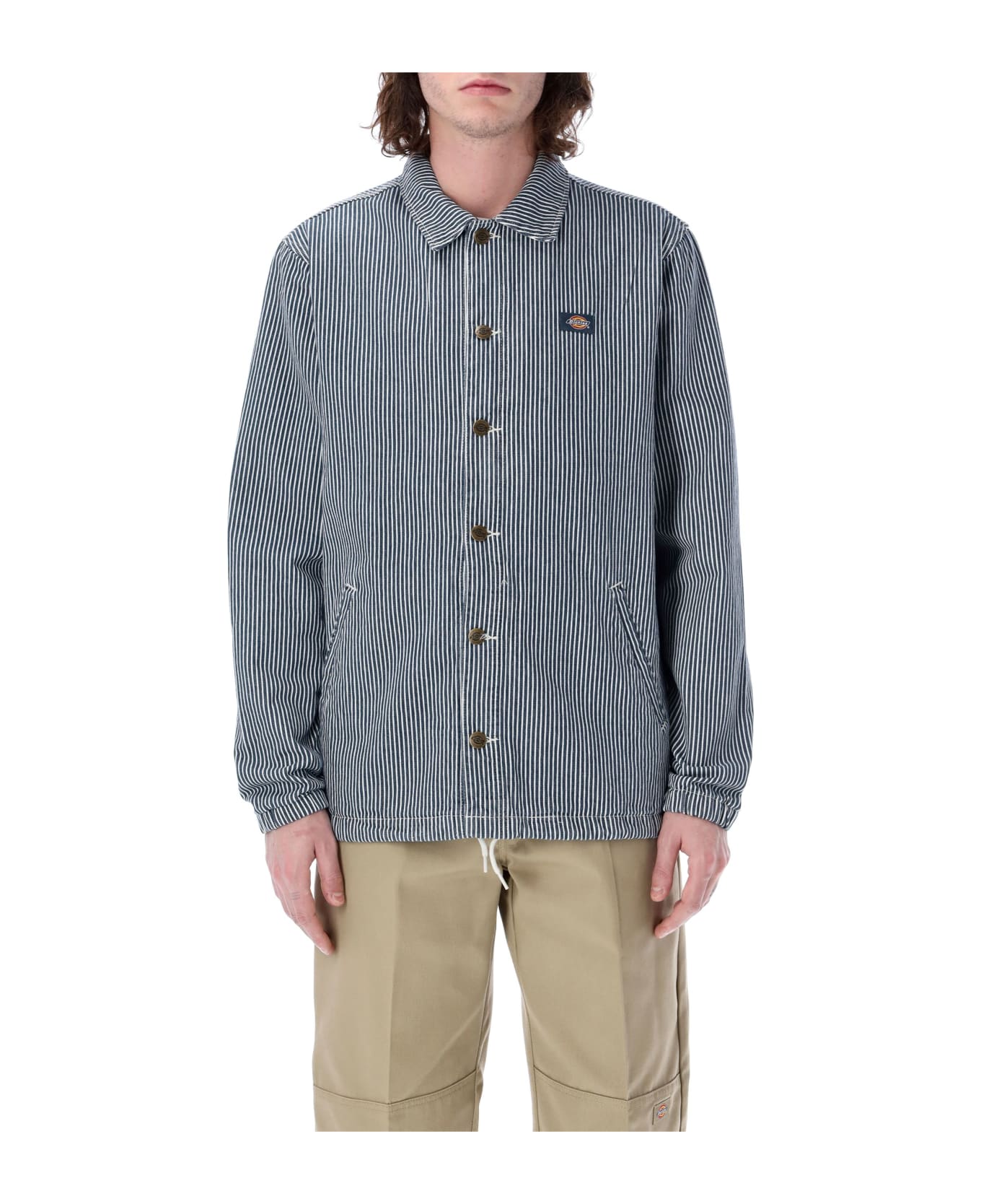 Cotton Hickory Coach Jacket By Dickies. Featuring: Point Collar Striped Pattern Front Button Fastening Two Welt Pockets Label At Left Chest Long Sleeves With Elasticated Cuffs Drawcord At The Hem Model Is 1,90 M Tall And He Is Wearing Size L