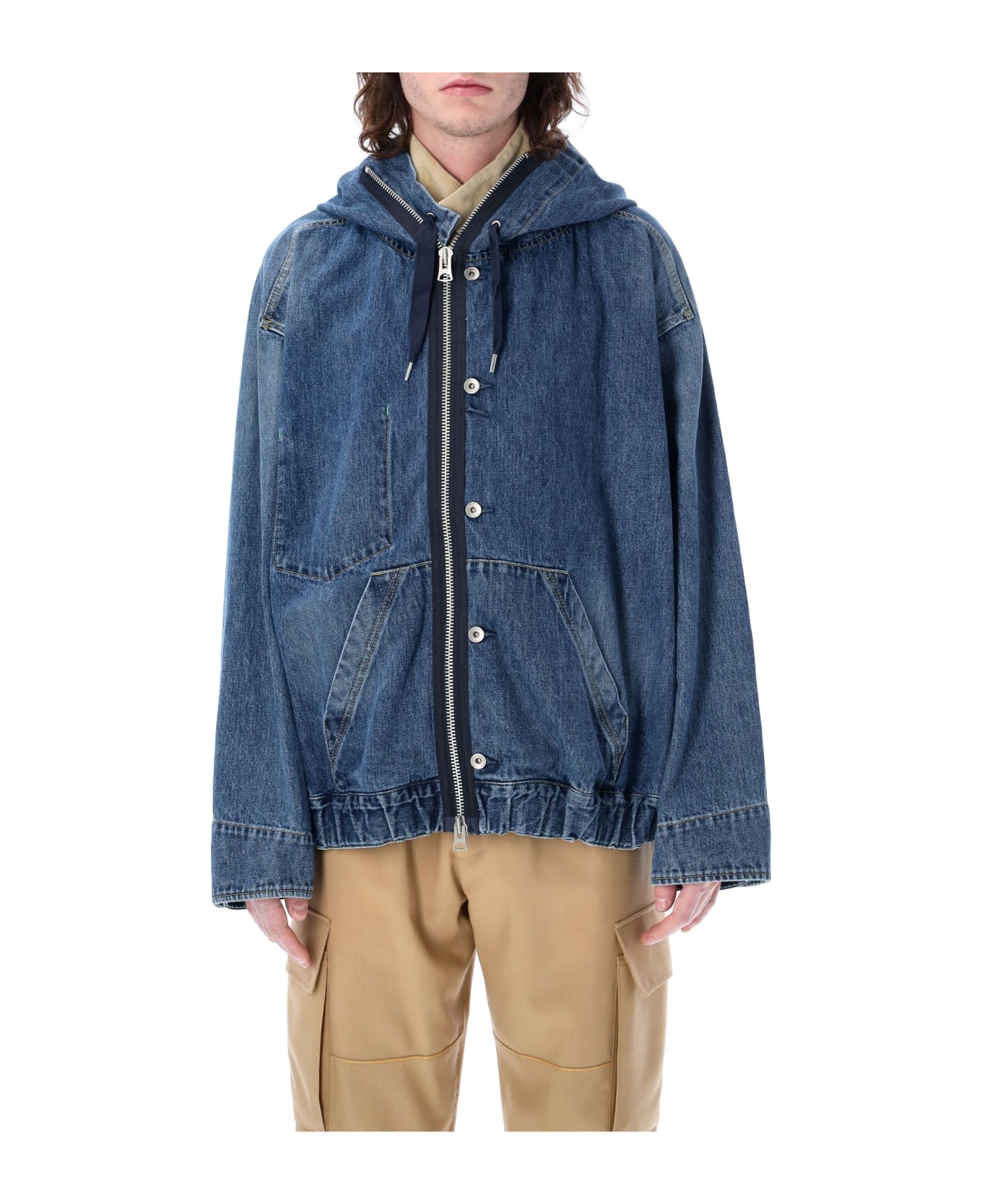 Hooded Denim Jacket By Sacai. Featuring: Drawstring Hood Contrast Corduroy Pointed Collar Zip Fastening Kangaroo Pocket Dropped Shoulders Elastic Hem Loose Fit The Model Is 1,90 M Tall And He's Wearing Size 3
