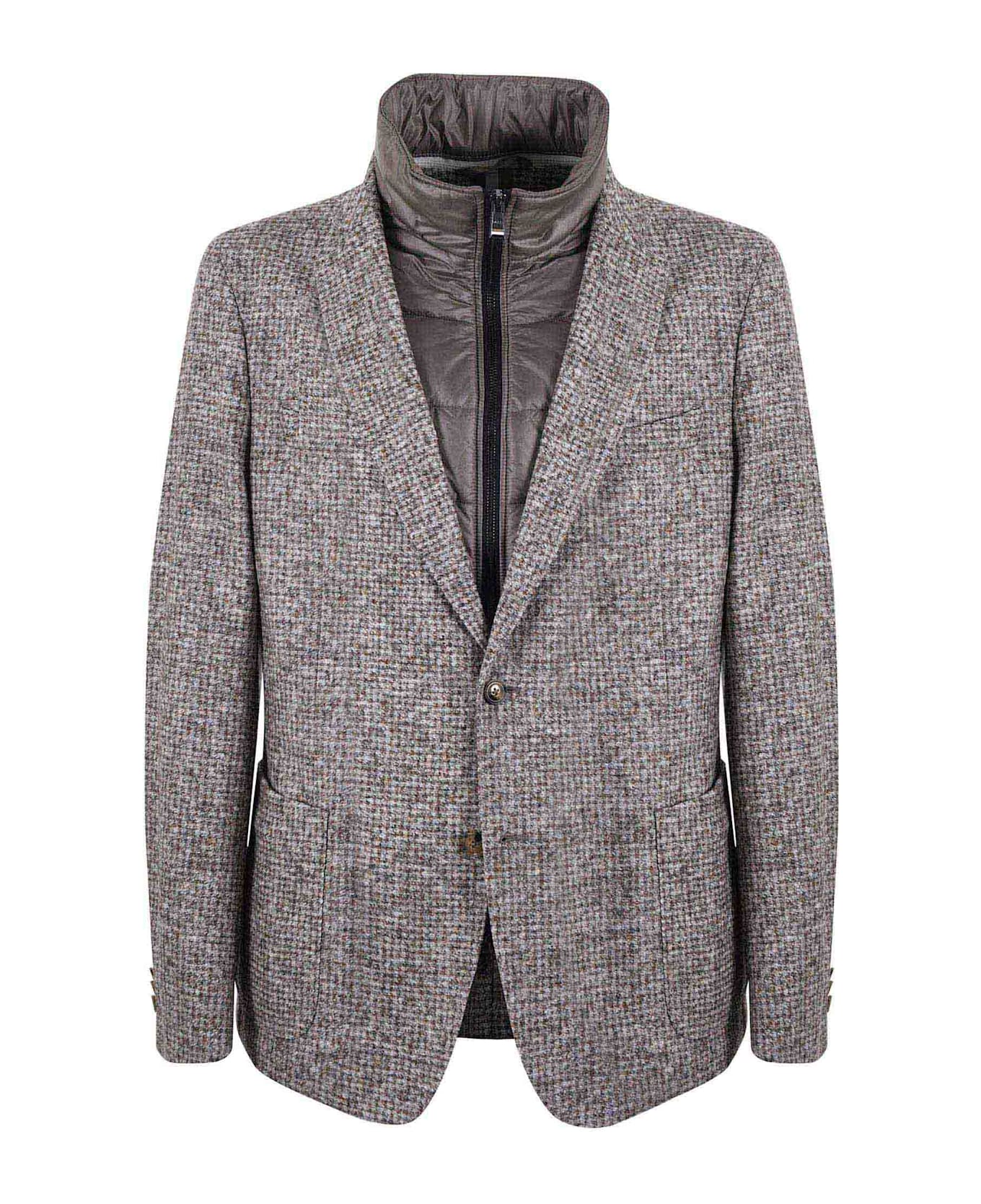Hugo boss jacket in wool and cotton jersey with Beige and White houndstooth pattern. Classic lapel. Welt pocket on the chest. Front patch pockets. Two button closure. Detachable dove gray quilted nylon front. Double slider closure. Central vent on the back. Internal pockets. Lined sleeves. Slim fit Measurement in photo: 50 38% cotton 38% wool 24% polyester lining 93% polyester 7% polypropylene