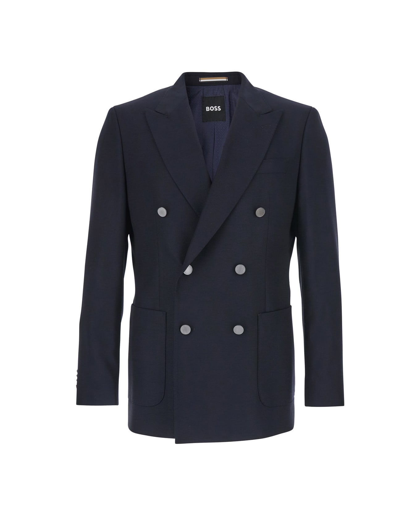 Jacket Blue Double-breasted Peak revers Long sleeves Front button closure One front welt pocket Two front patch pockets Straight hem Rear single vent Wool blend Regular fit