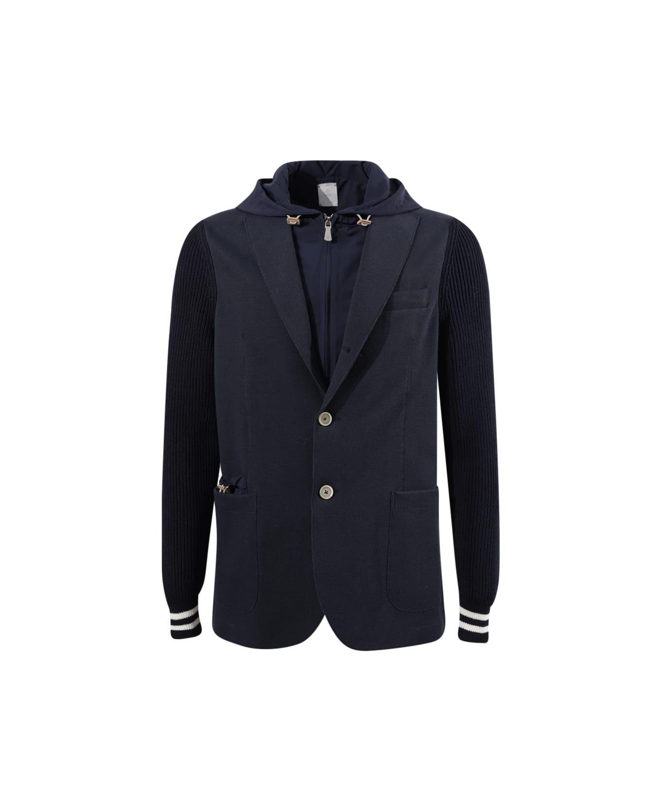 7 gauge knit sleeves, RS Loro Piana nylon bib with buttons, zip, fixed hood. Composition: 82% Cotton. 15% Nylon, 3% Elastane. Sleeves: 100% Cotton. Made in Italy