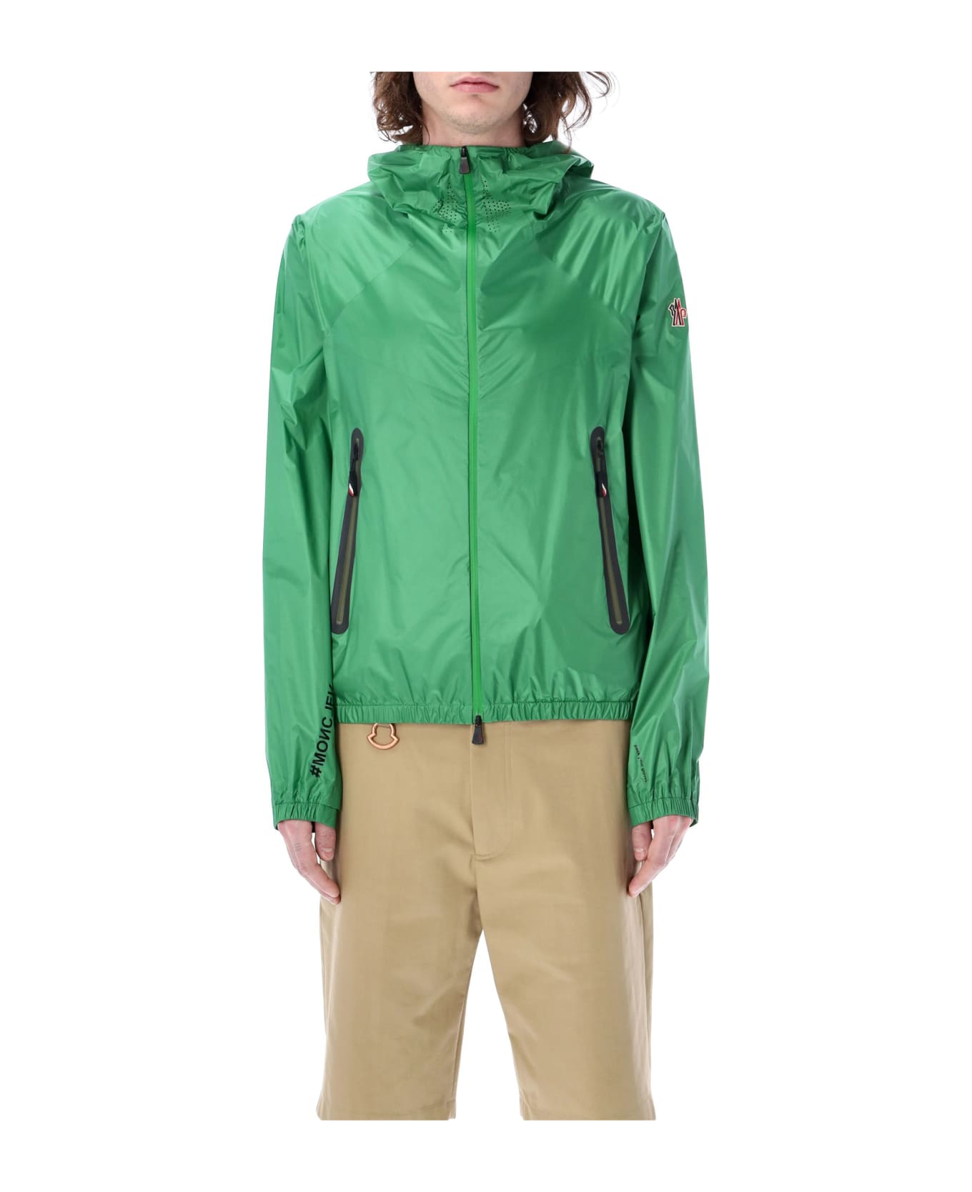 Leiten Windbreaker By Moncler Grenoble. Featuring: Packable Breathable And Water Repellent Elasticated Hood Zipped Pockets At Side Long Sleeves Logo Patch Perforations Elastic Cuffs And Hem Model Is 1,90 M Tall And He Is Wearing Size 3