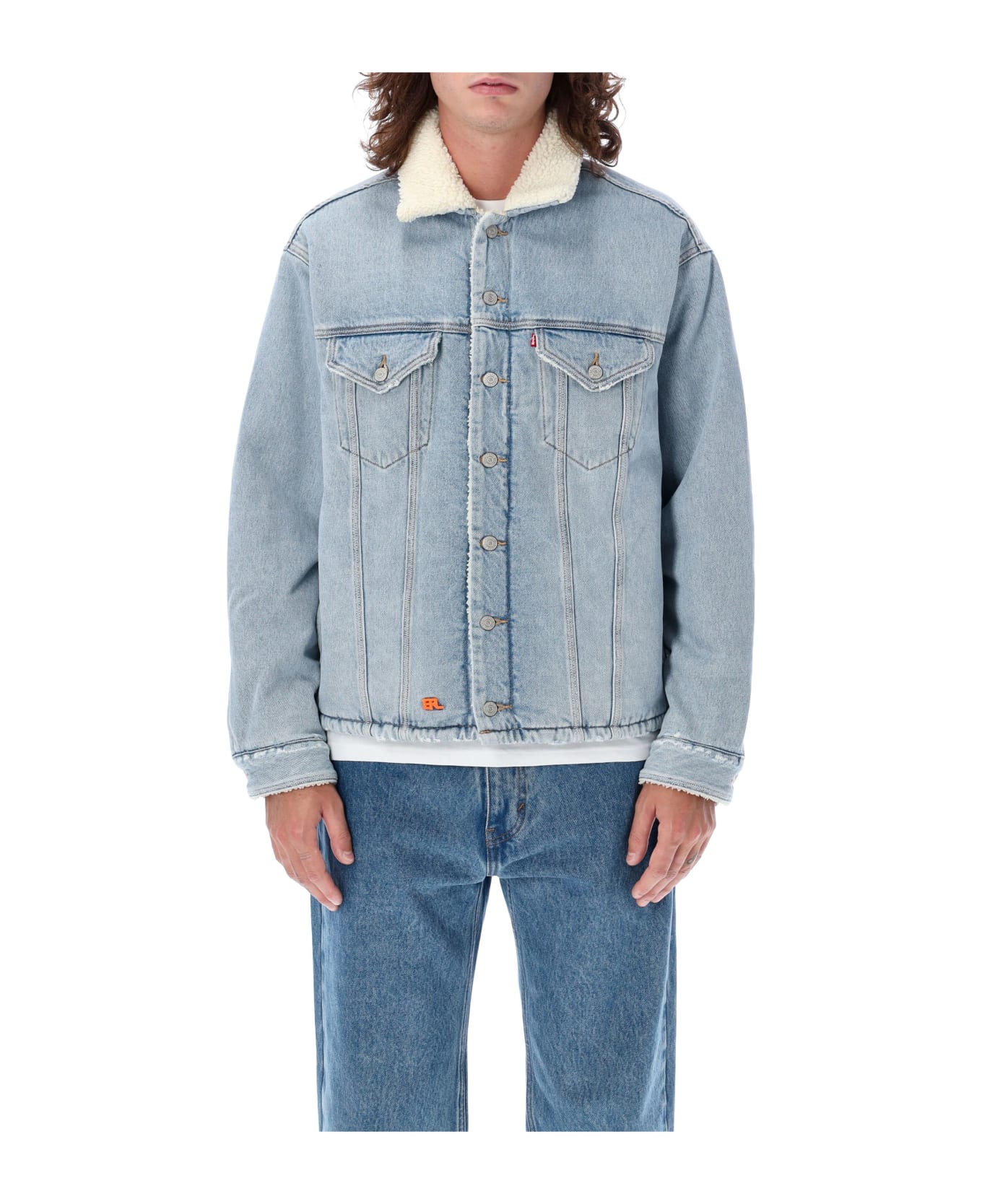 Levi's Sherpa Trucker Jacket By Erl. Featuring: Point Collar Long Sleeves Central Button Closure Buttoned Cuffs Flap Pockets At Chest Lateral Welt Pockets Embroidered Logo At Front Inner Pocket Stitching Details Sherpa Lining Denim Style Model Is 1,90 M Tall And He Is Wearing Size L