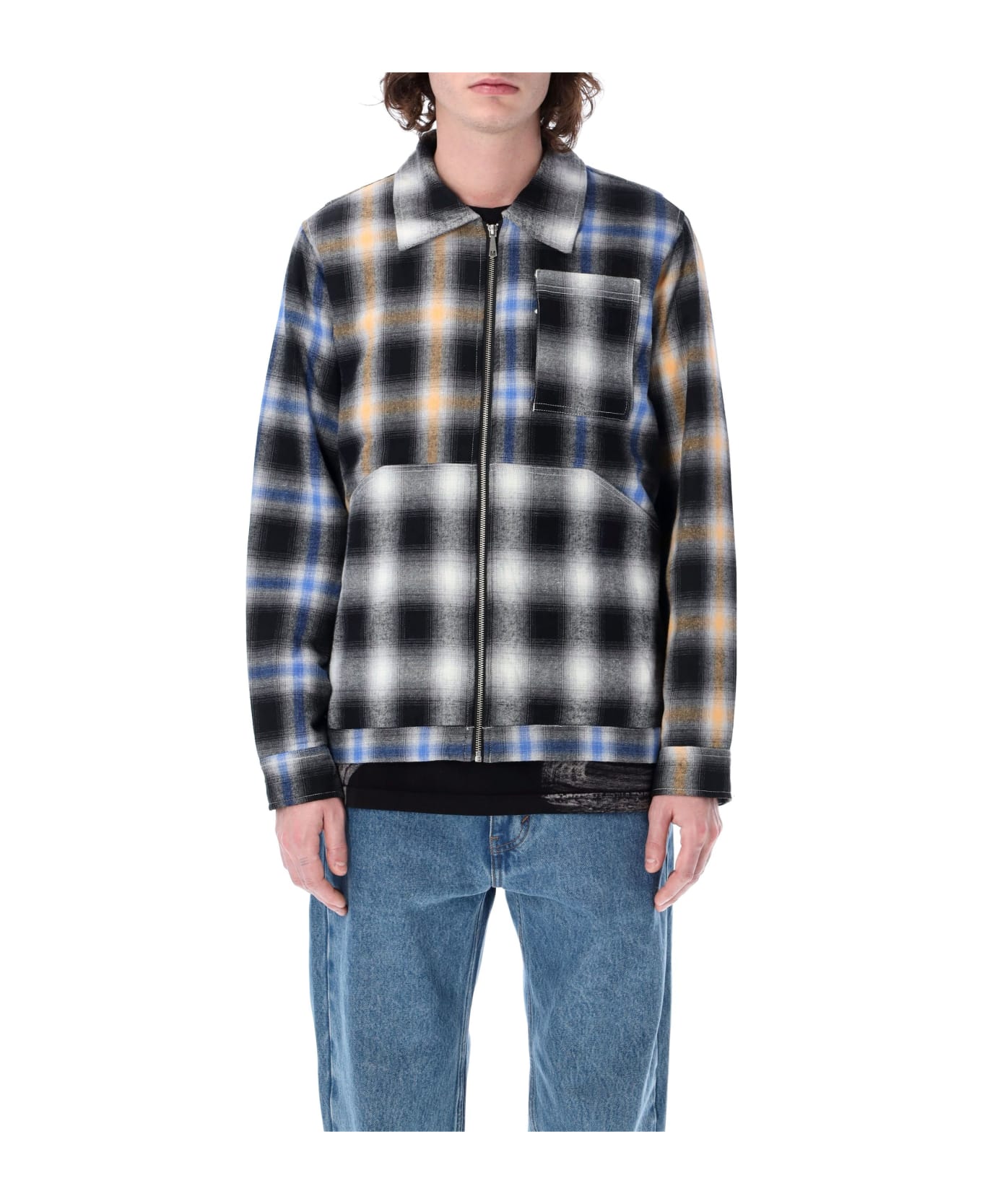 Cotton Nelson Jacket By Market. Featuring: Check Pattern Point Collar Patch Pocket At Chest Side Slit Pockets Long Sleeves Buttoned Cuffs Quilted Nylon Lining Straight Hem Model Is 1,90 M Tall And He's Wearing Size L