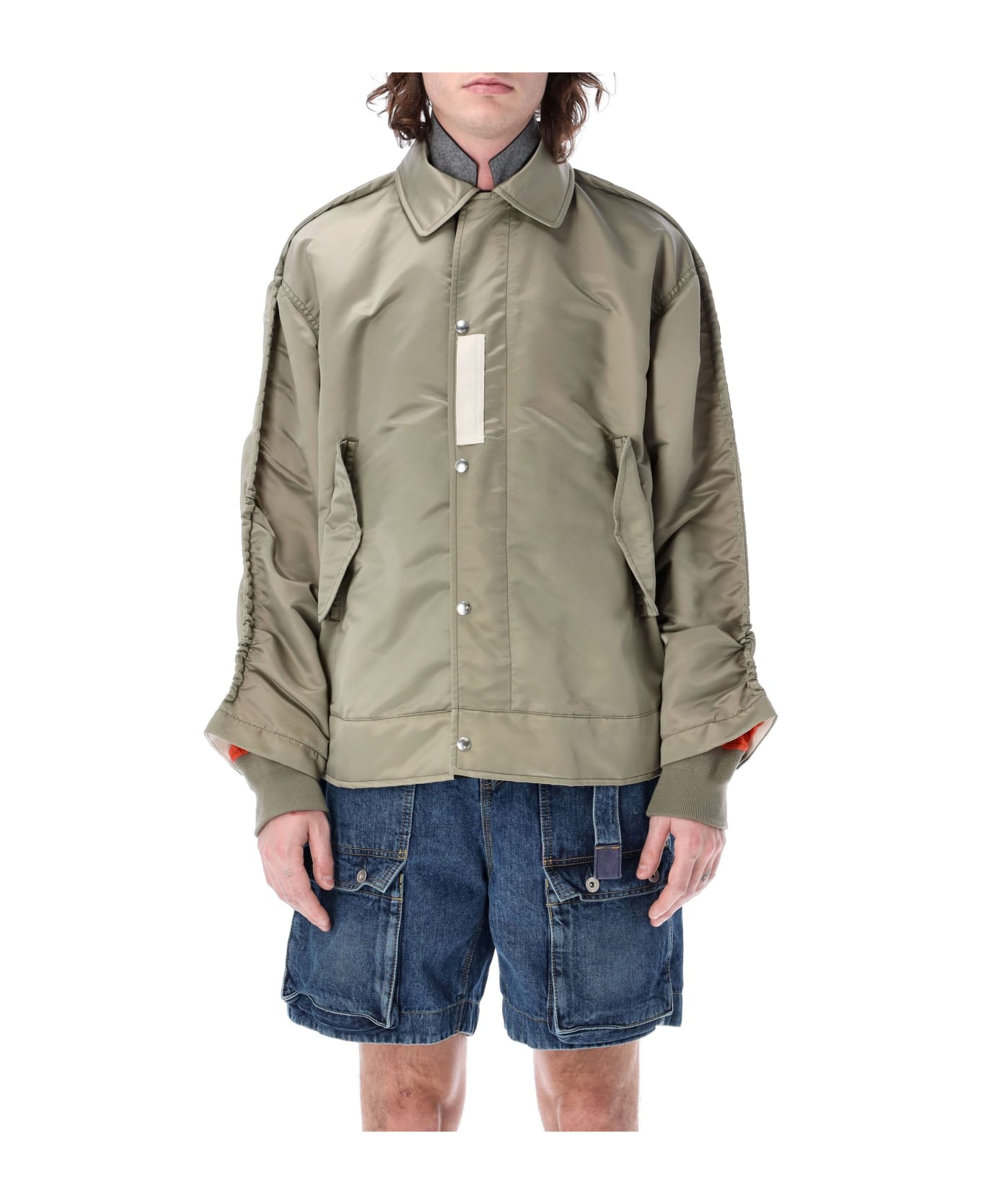Nylon Twill Blouson By Sacai. Featuring: Layered Pointed Collar Zip And Snap Buttons Fastening Long Sleeves Dropped Shoulders Side Flap Pockets Adjustable Strap With Buckle At Hem The Model Is 1,90 M Tall And He's Wearing Size 3