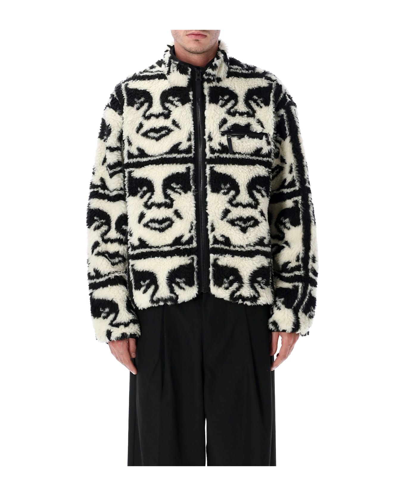 The Obey Repeated Icon Sherpa Jacket Is A Statement Piece Blending Warmth With Bold Street Style. Made From Jacquard Sherpa Fleece, It Showcases The Signature Obey Icon Pattern Repeated All-over For A Striking Graphic Effect. Fully Lined For Comfort, With A Vislon Front Zip And Secure Side Pockets, This Jacket Is Ideal For Everyday Layering During Colder Months. Jacquard Sherpa Fleece All-over Icon Repeat Graphic Vislon Front Zipper Closure Zip Side Hand Pockets Lycra Binding At Zipper, Hem And Cuffs Fully Lined Interior Regular Fit Andrea Is 1,90 M And Wears Size L