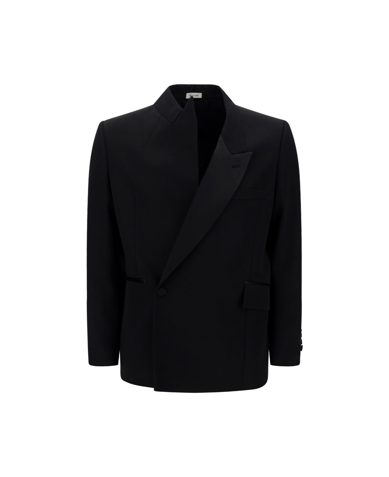 Wool tuxedo blazer jacket by alexander mcqueen, double-breasted front closure with contrasting buttons, asymmetrical spear lapels, two side welt pockets, back slit, structured shoulders, regular fit. Composition: 100% % Wool