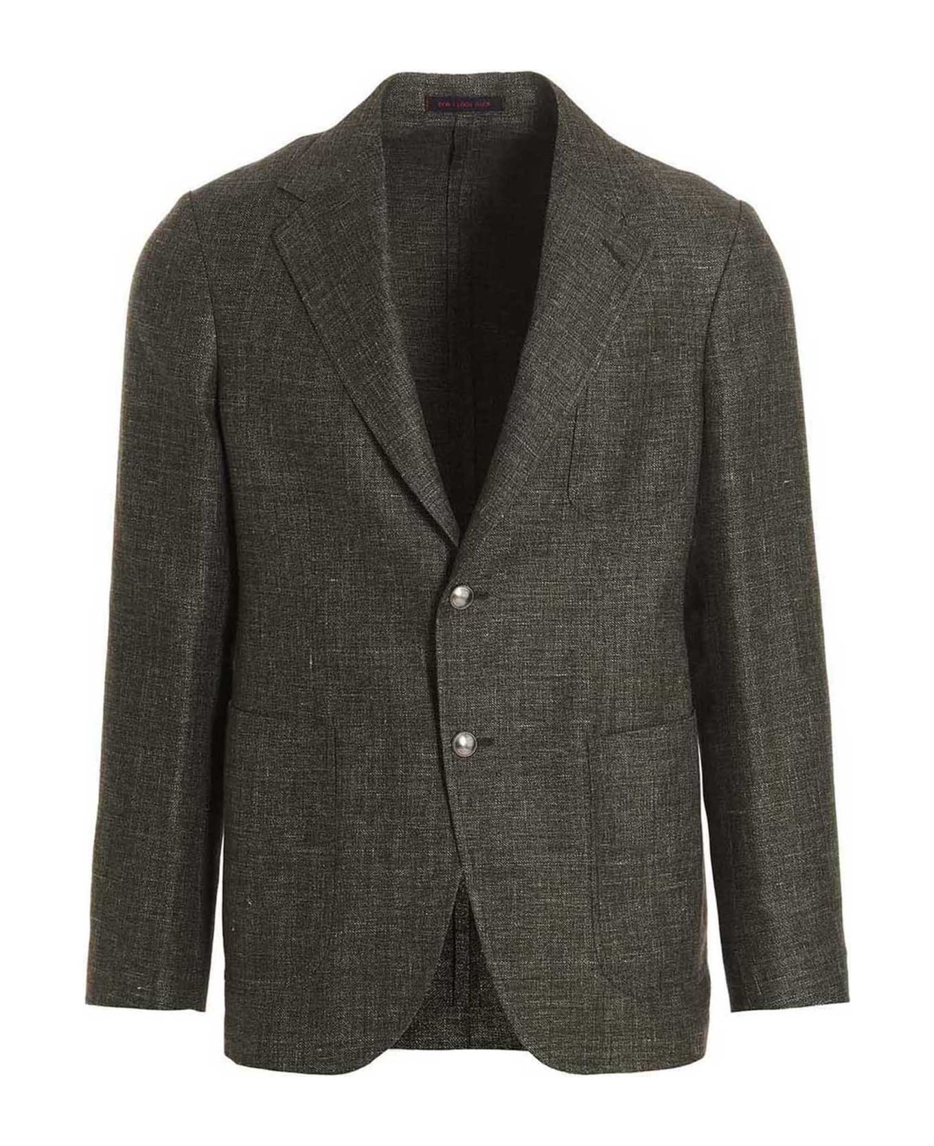 'Pier T1' single-breasted linen blend blazer jacket with mirror lapels, patch pockets and button closure.