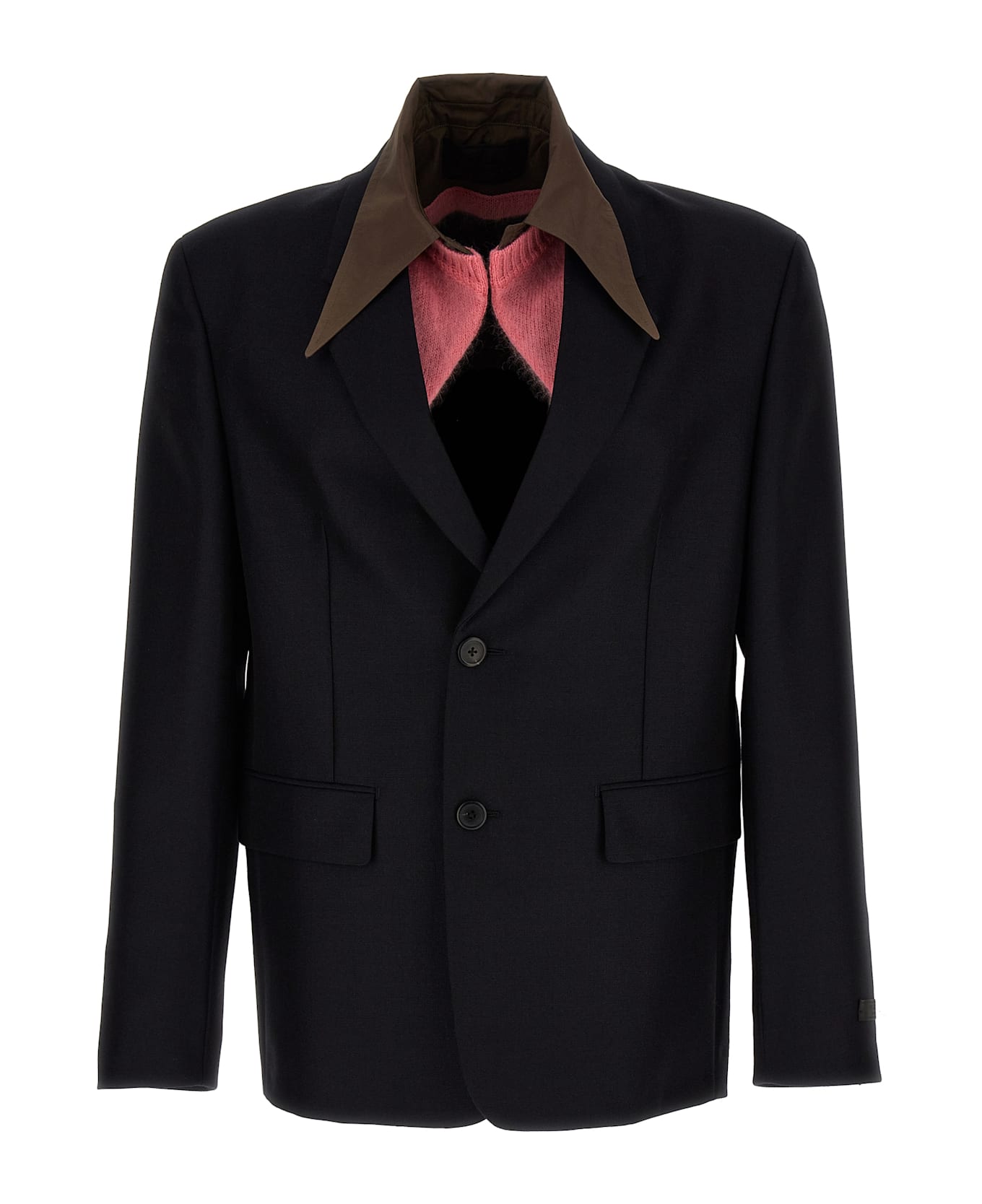 Single-breasted wool and mohair blazer with removable collar detail, button closure, pockets, long sleeves. Composition: 60% wool, 40% mohair