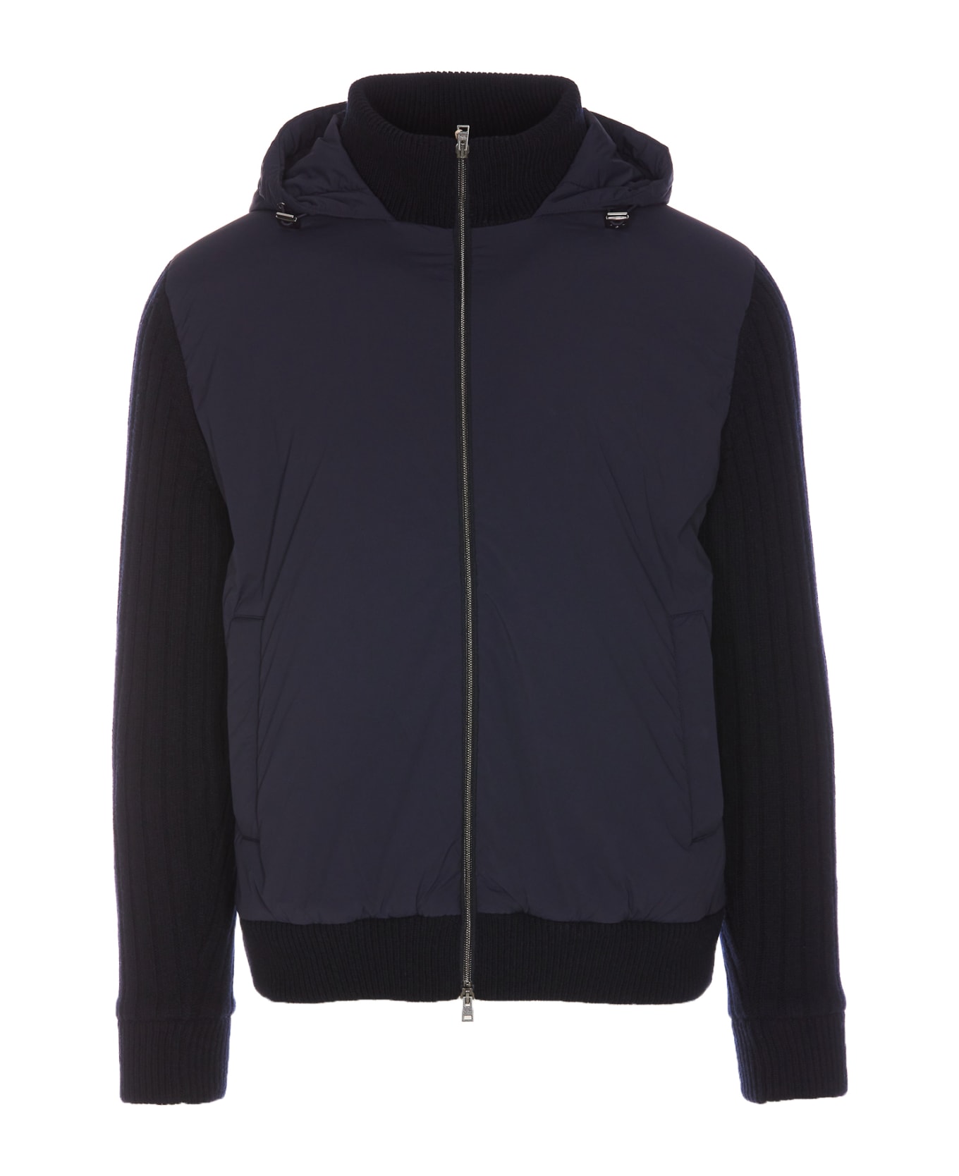 Herno blue navy light padded cardigan, with frontal zip closure, hood detail, knitted long sleeves, knitted detail, lateral pockets with button closure Composition: 100% Wool, 86% Polyamide, 14% Elastane, 100% Polyester