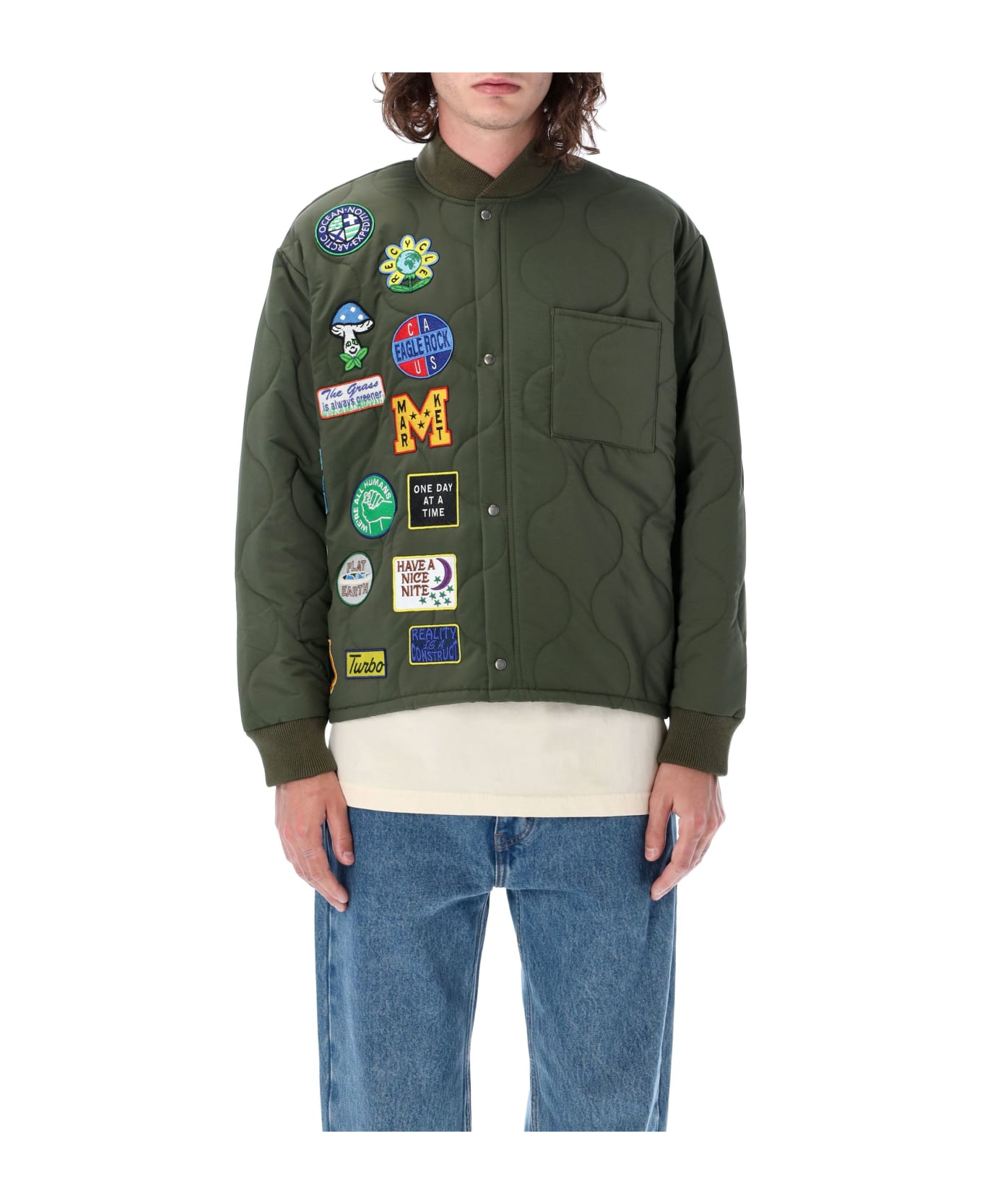 Rw Logo Patch Liner Jacket By Market. Featuring: Ribbed Collar Front Zip And Press Studs Fastening Patch Pocket Long Sleeves Ribbed Cuffs Quilted Design Multiple Patches Straight Hem Model Is 1,90 M Tall And He Is Wearing Size L