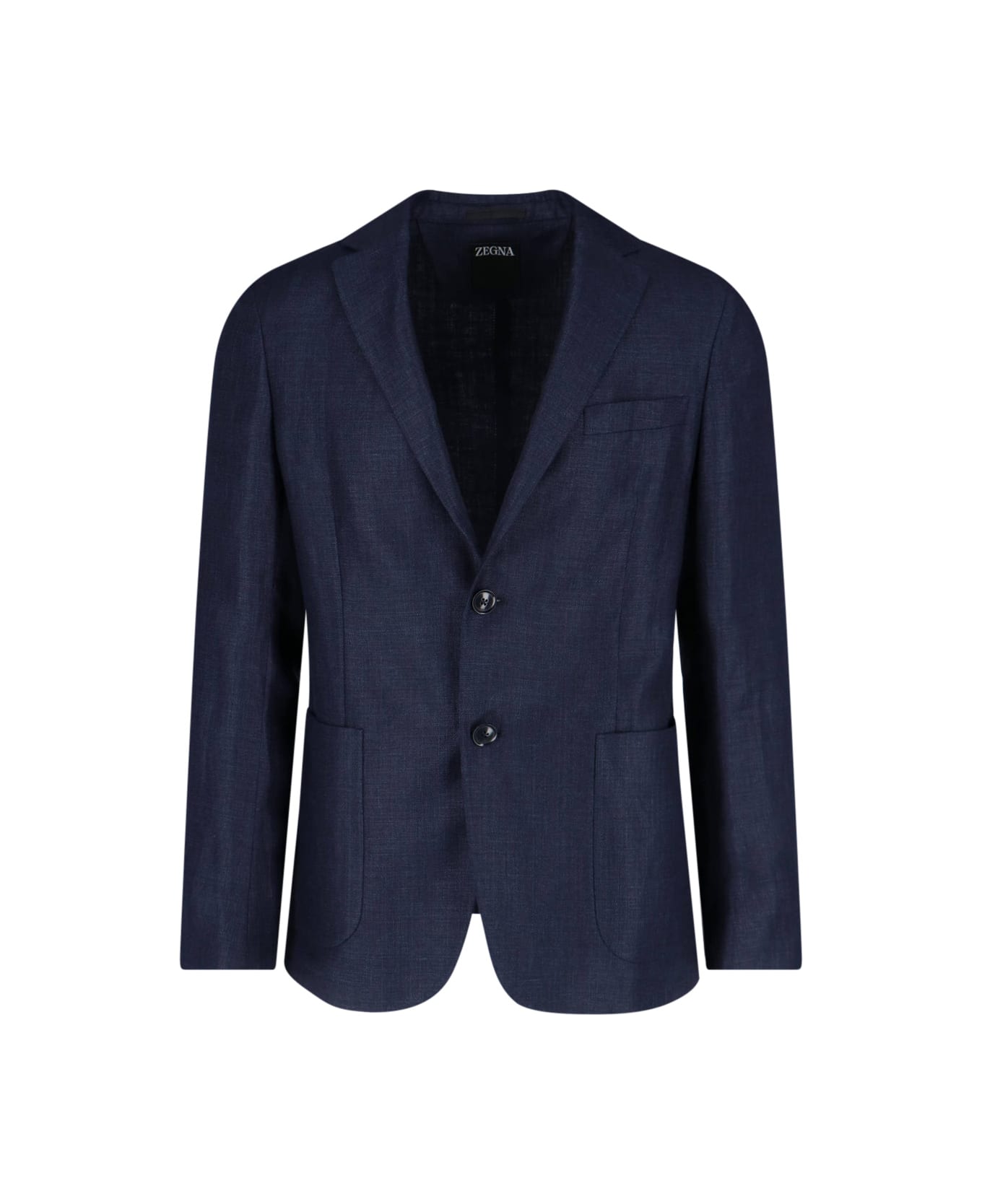 Zegna single-breasted blazer in navy blue linen and wool, classic lapels, two-button closure, chest pocket, two side flat pockets, button cuffs, straight hem. Composition: 58% Linen, 42% Wool