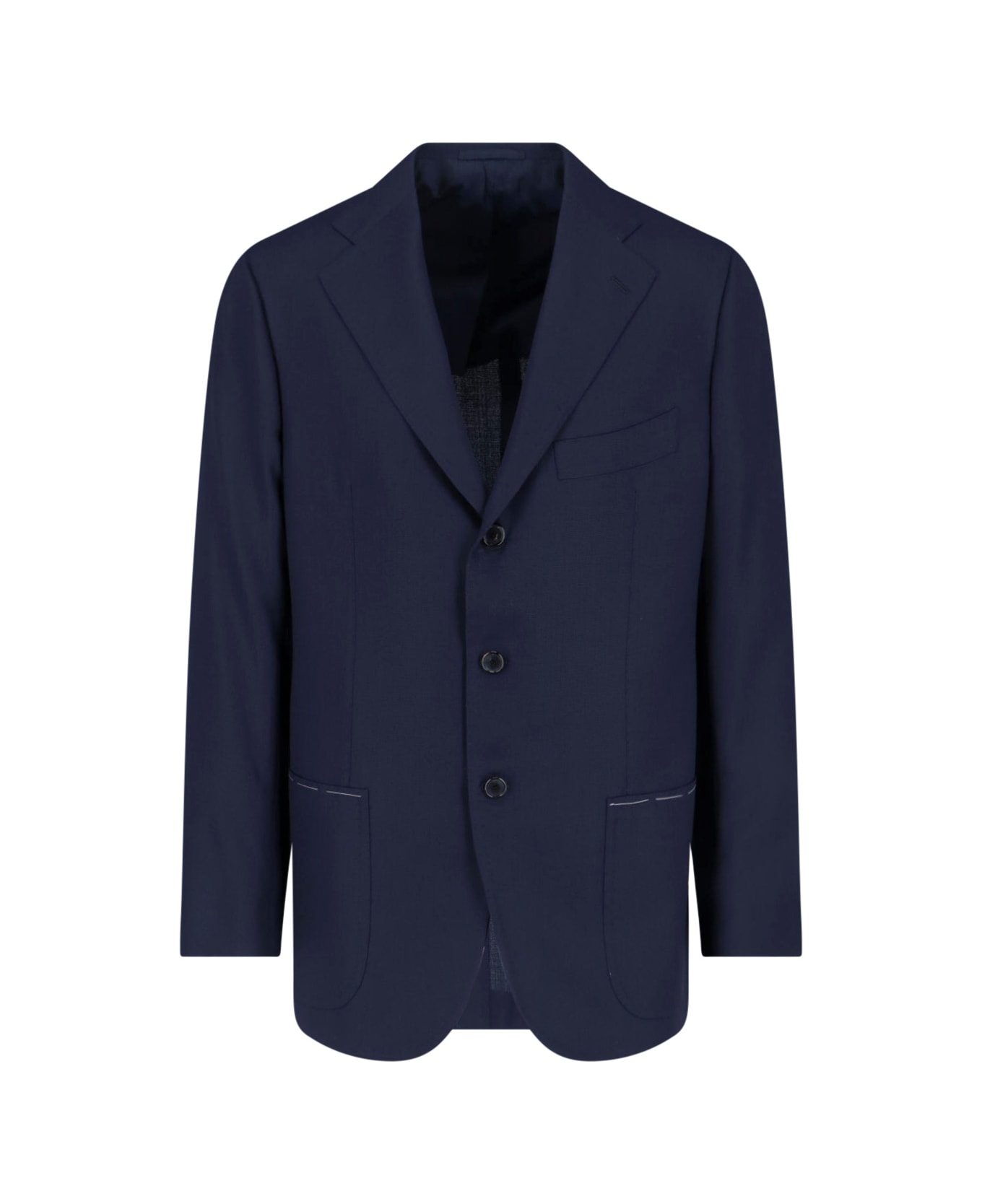 Single-breasted blazer in Cesare Attolini wool, navy shades, classic lapels, button closure, flat front pocket, two side pockets, contrast stitching detail, inner flat pocket, curved hem on the front, straight back.