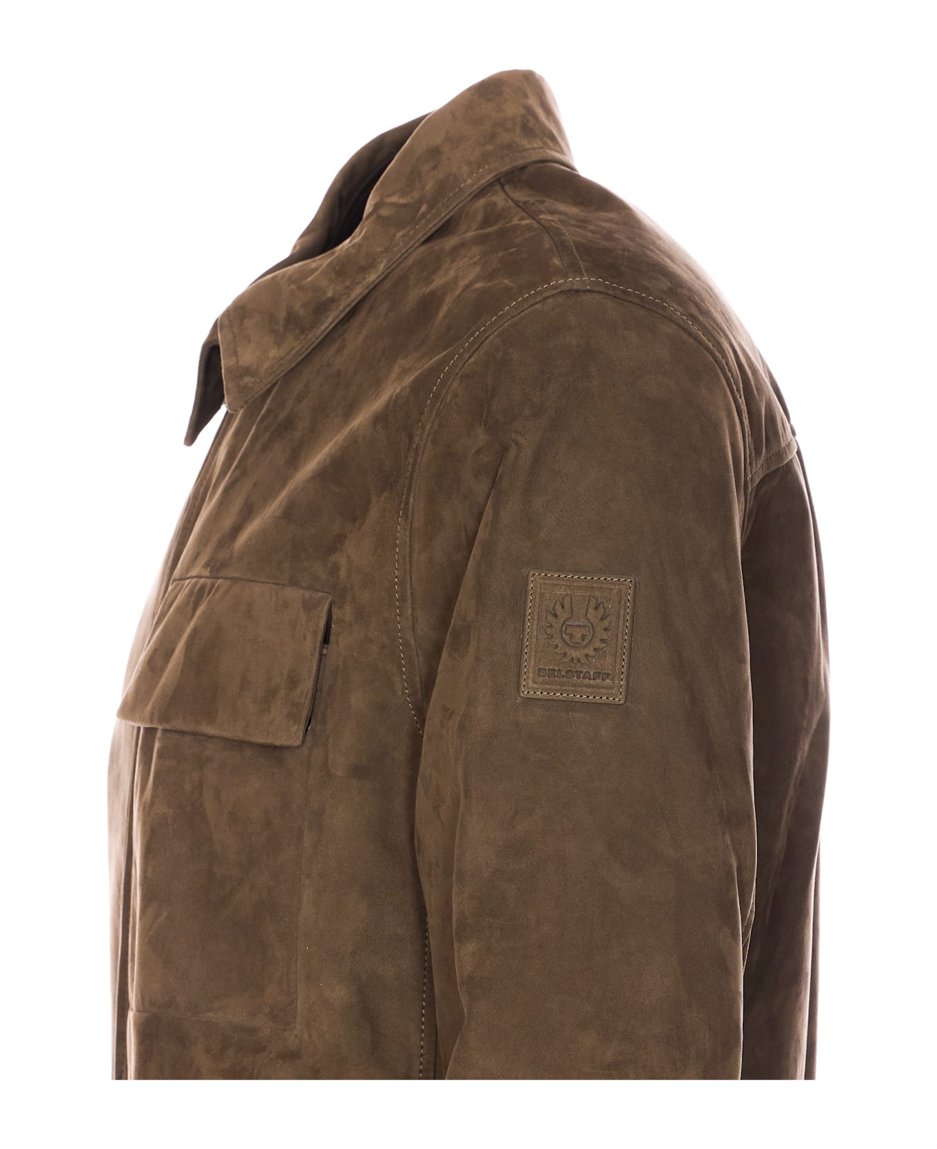 Belstaff green suede frame overshirt jacket, frontal zip closure, regular collar, long sleeves, lateral patch logo, lateral pockets Composition: 100% Lamb Leather, 100% Viscose, 100% Cotton