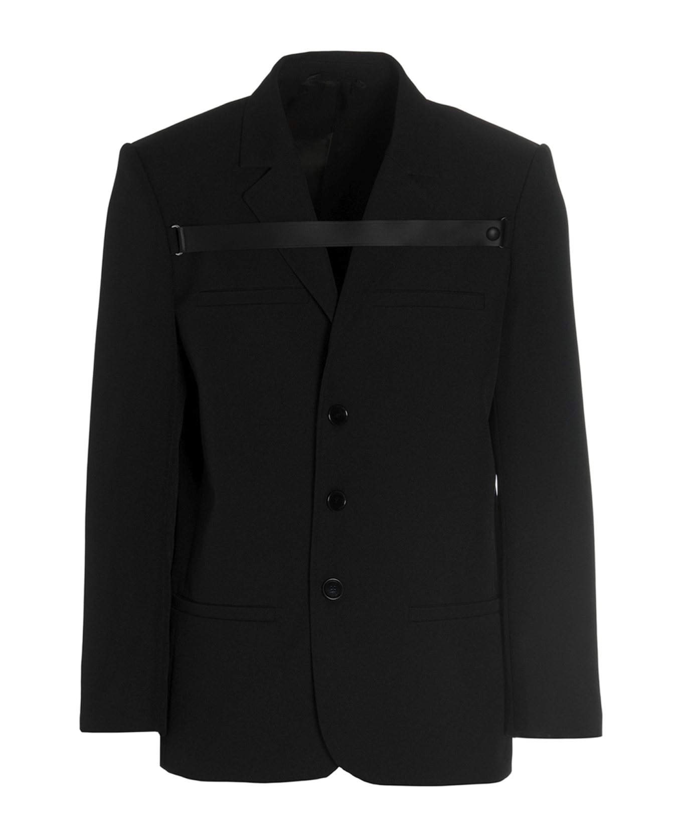 'Tailleur Harnais' single-breasted blazer with button closure, leather band detail at the front and back, pockets, long sleeves, back vent. plit. Composition: 100% polyester