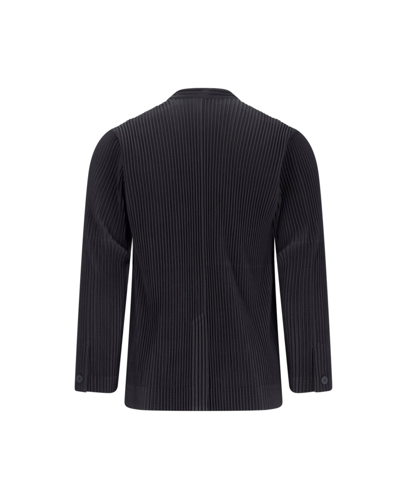Homme Plissé 'Tailored Pleats 1' blazer in black fabric with pleated pattern, shawl collar, two button closure, button cuffs, two side pockets, central back vent, straight hem.
