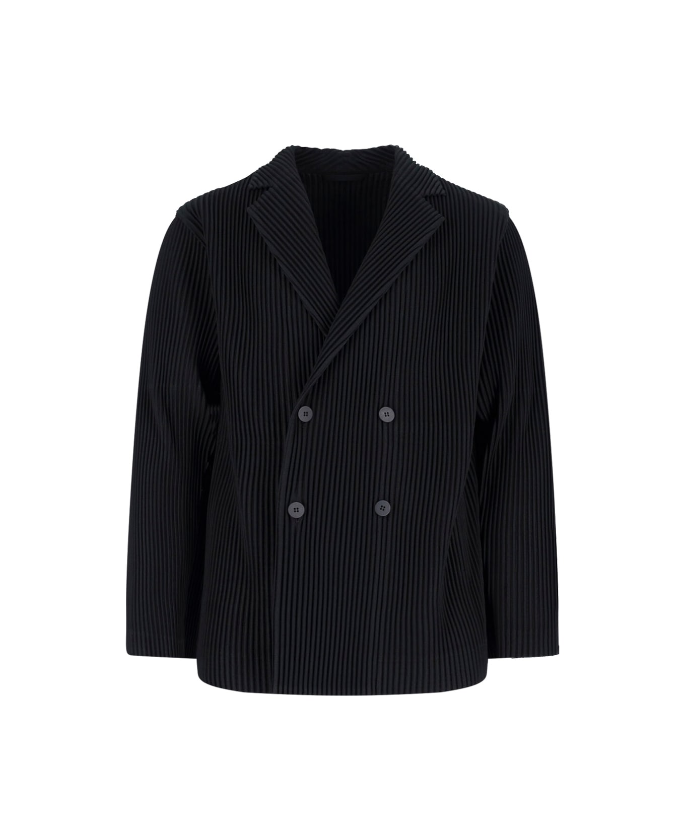 Homme Plisse Tailored Pleats 1 pleated jacket in black fabric with classic lapels, double-breasted, button closure, two side pockets, button cuffs, and straight hem. Composition: 100% Polyester